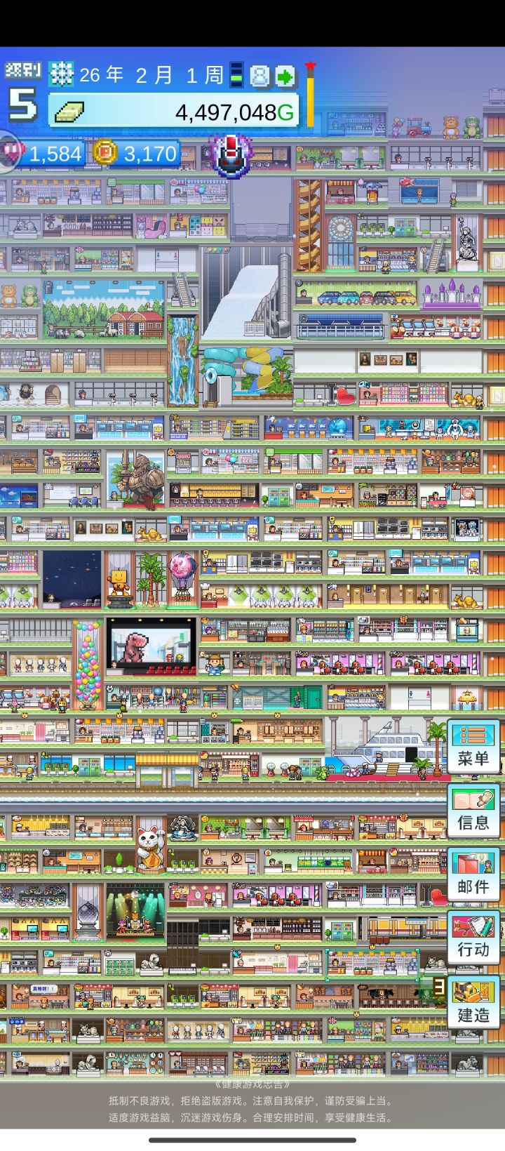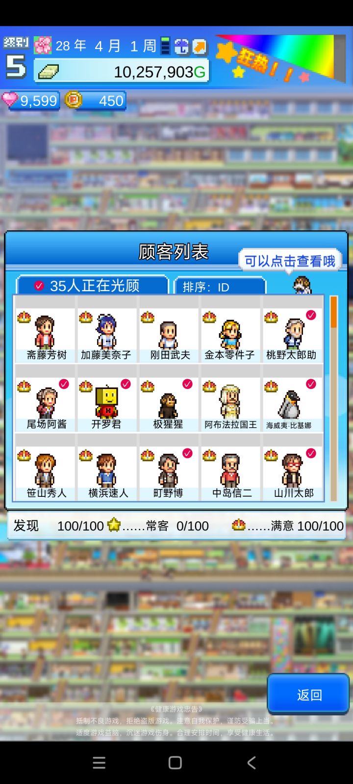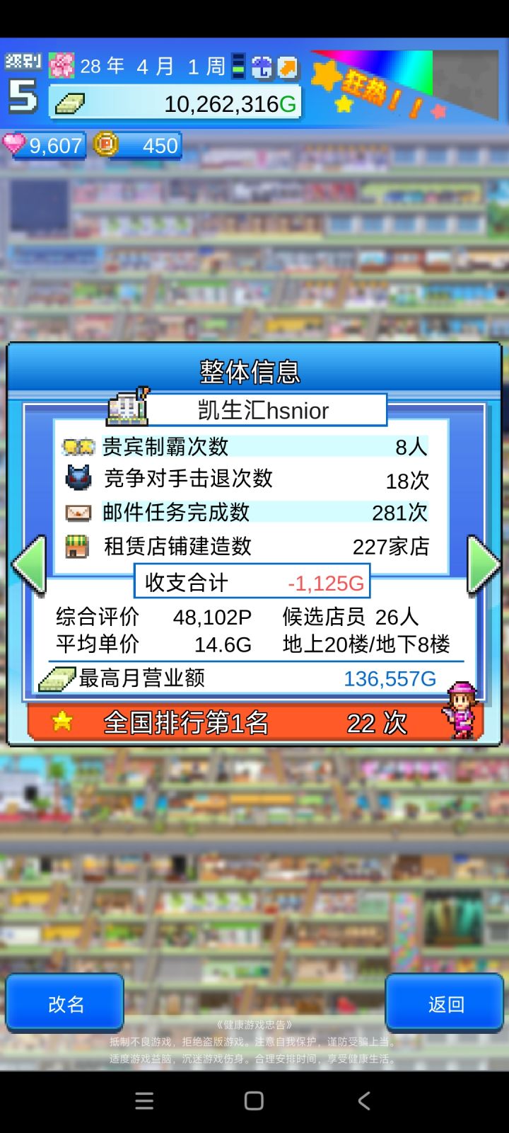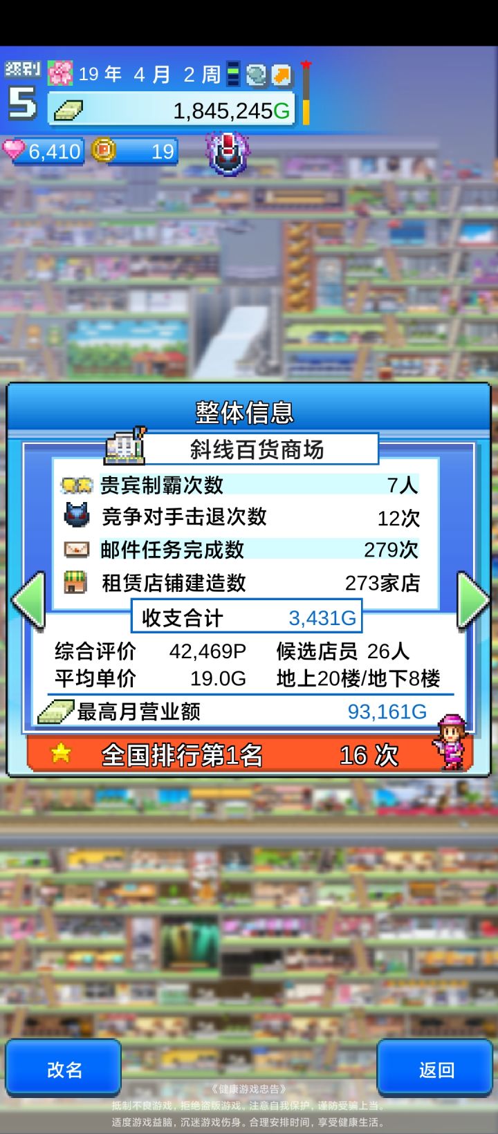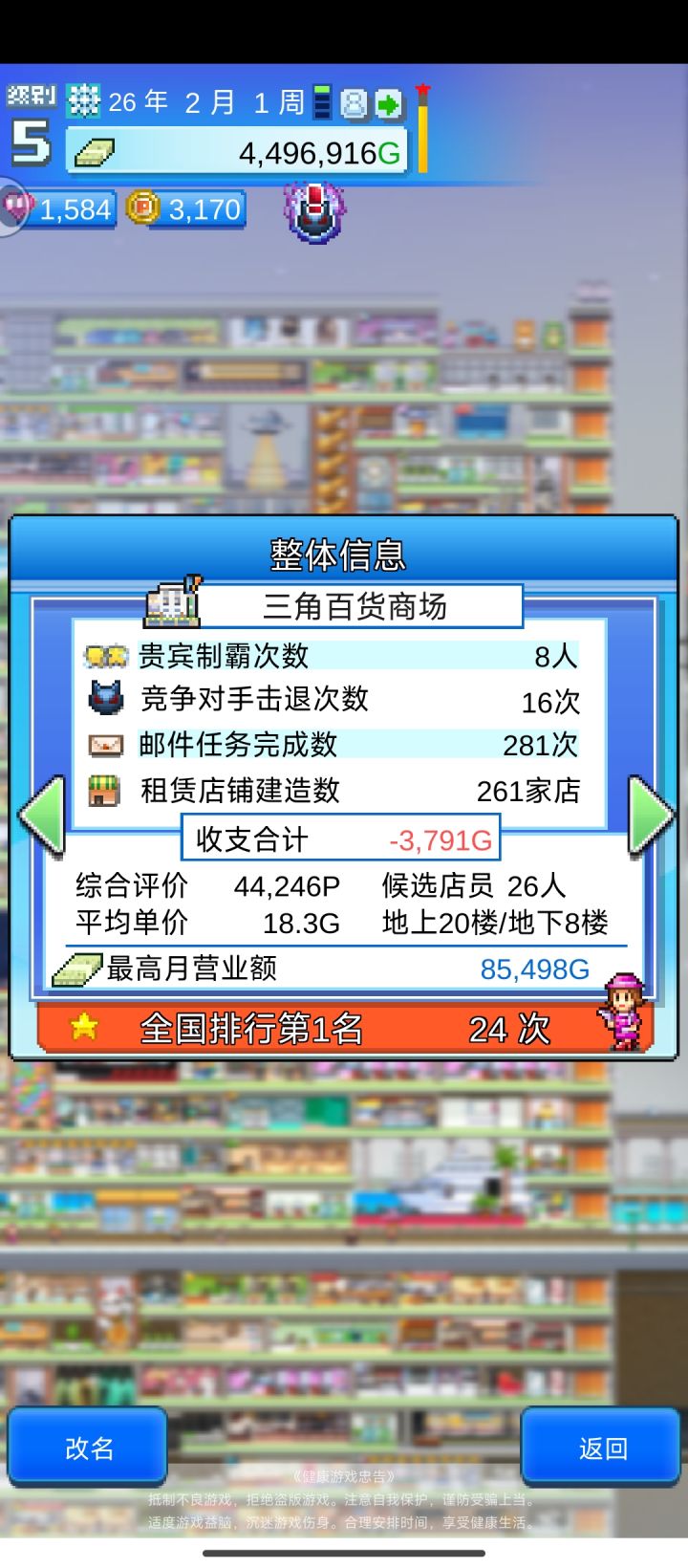 最近没啥游戏玩,爆肝三天,开罗永远的神本来13年就全部弄完了,但游戏一定要15年才能通关,通关之后二周目只能继承专柜词典,本来想玩二周目的,但是二周目没有新内容了。全邮件任务全专柜全顾客最终得分最后放几张百货大楼的图,布局是照着大佬的来的,省了很多时间。 玩之前看了不少攻略,因为想一次就玩完游戏全部的内容,像布局专柜这些都需要花很长时间,于是就看了攻略。但还是有很多东西需要自己摸索,