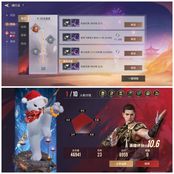 任务尽量是我图里的几种,然后单人开困难人机的四排,难度低了,人机就不会找你,高了又容易出意外,就可以了 ,对了,还有英雄尽量选那种对群能力强的,比如和尚,这一步是避免乱拳打死老师傅