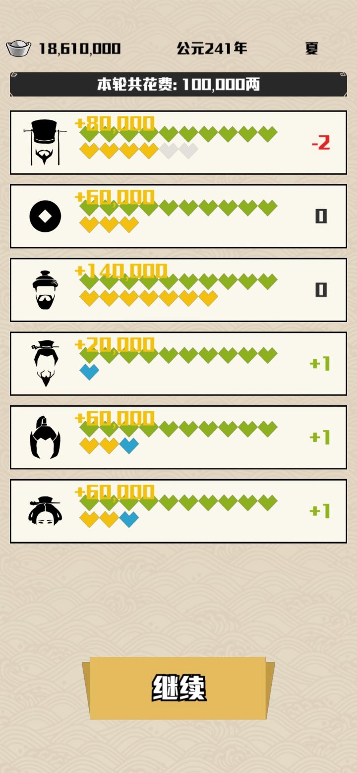 游戏一开始会有难度,但是有的环节设计的……首先这个游戏里将士和宗室是你随便欺负的,这两个是最容易针对他一个造福千万家的,十分常见的就是两个减1或者是三个减一,剩下的全加,只要没打仗就疯狂针对他俩,在商贩或者是百姓到18 19的时候,再支持他们两个制衡一下,如果造反就拿钱解决,打仗也是一样,能打赢就打,不能打赢无所谓,就当只是一个多花钱的回合而已,和平时期稍微运营一下,应该能有三个14以上,或者两个
