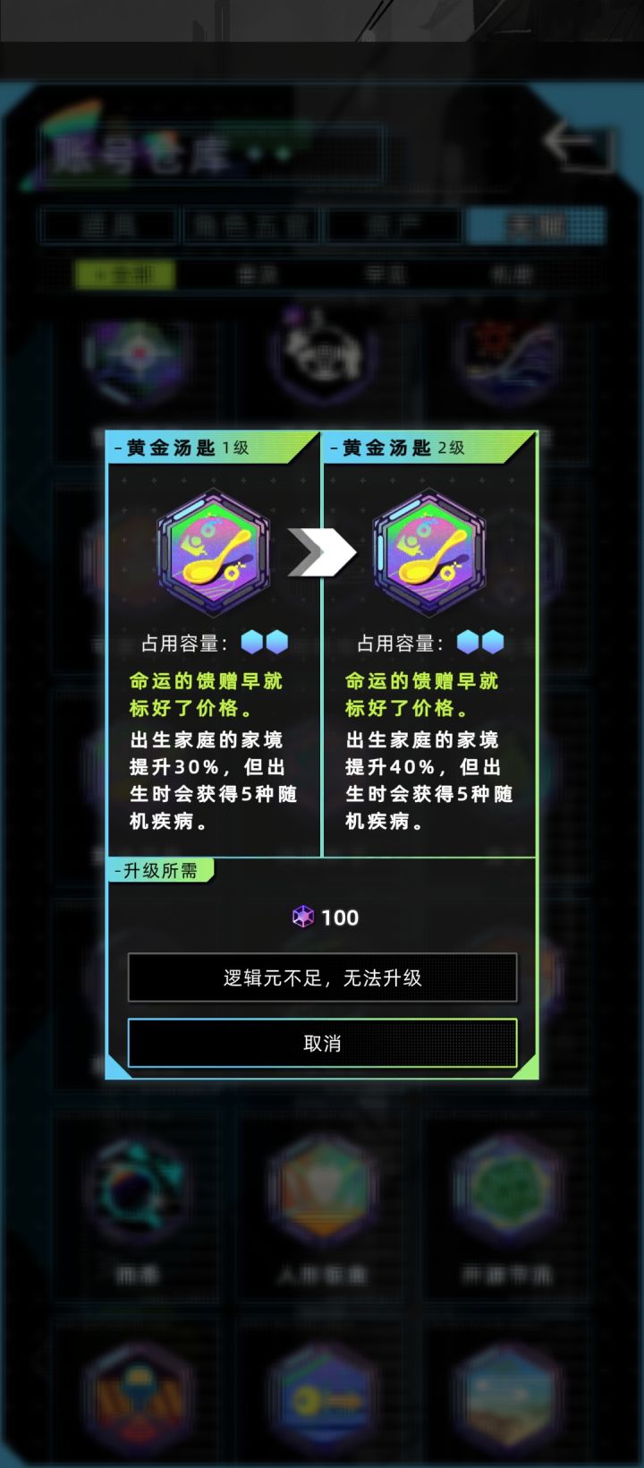 #未来人生攻略 1,天赋有用的没多少,这边唯一建议先拉满的是《可爱范式》,拉满之后青春永驻,角色不会衰老,体验最好。然后有一个组合:黄金汤匙+暴雨,这两个配合起来可以刷人生等级,差不多一分钟不到,就有一千多,看广告就有两千左右,还能再加个天妒英才,保底两千,最高三千。黄金汤匙在商店的天赋里面,一千合成钶金。另外两个都在池子里,都是金色。2,职业第一代想要来钱快,中级教育选数字空间开发,