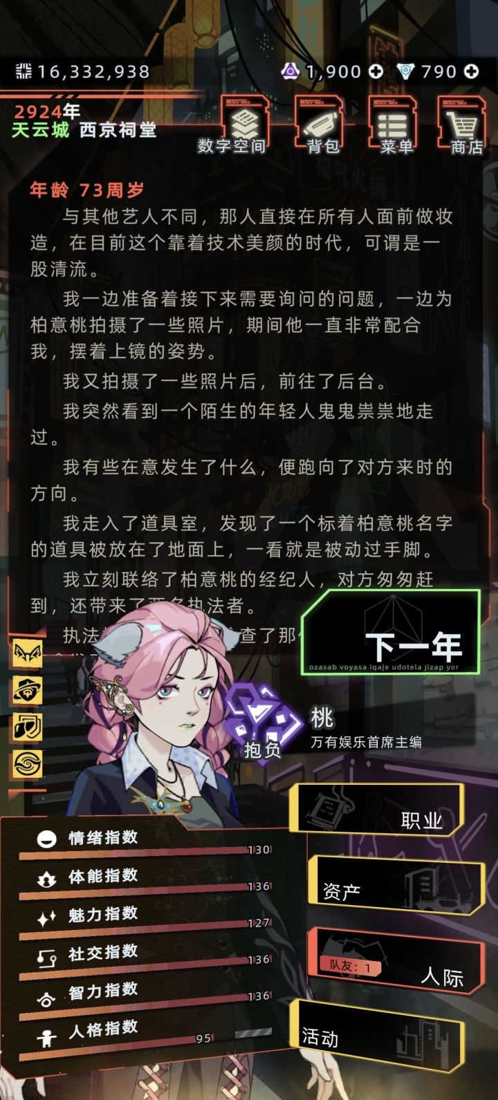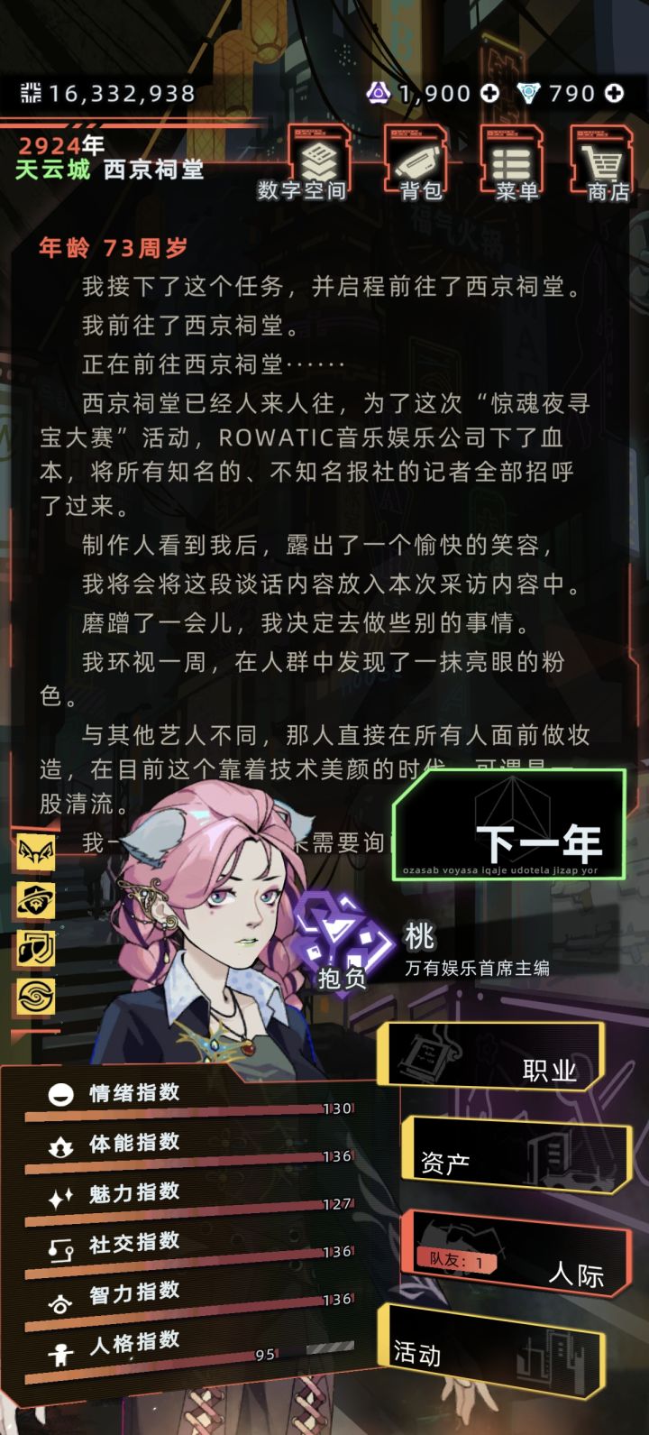 感觉之前那个攻略有点智障了,又优化了一下首先直接开始下一年,学习,学数字空间开发,结束中级学业,开始工作选项主要点理解力和熟练度,有点钱可以在资产设备中型买一个便携式工作站和全知辅助装置买一个脸部加熟练度的和颈部加理解力的,算法改进不用认真全消,改进先把可维护加到90,后面全加速度,这样每年都有不低的收入,在这个过程中可以收养一个孩子,他8岁带他去看数字骇客,只要有就看,保证在你死