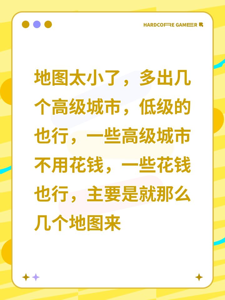 地图太小了,多出几个高级城市,低级的也行,一些高级城市不用花钱,一些花钱也行,主要是就那么几个地图来来回回的有点无聊
