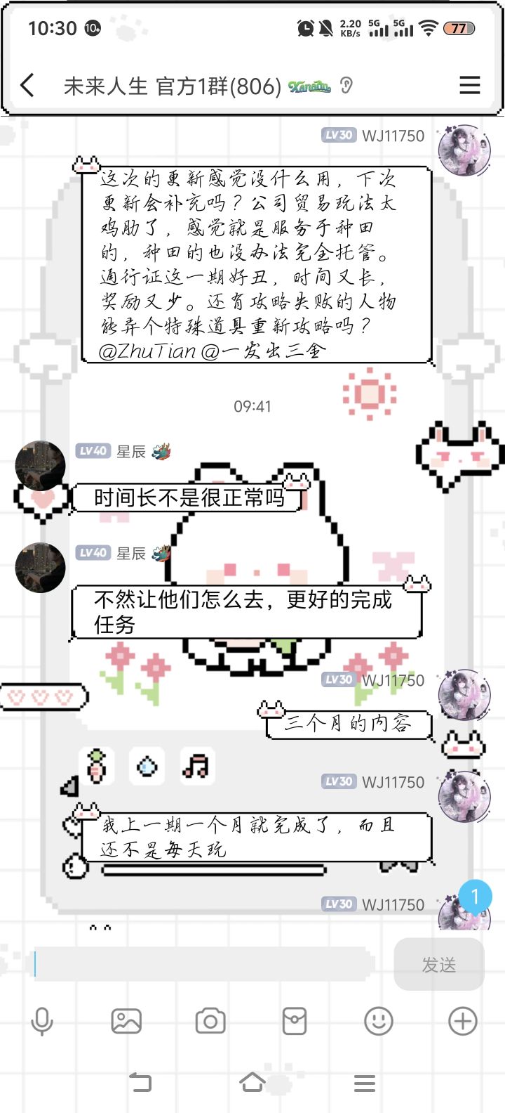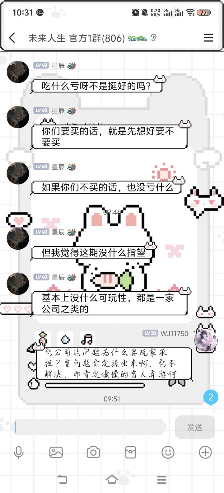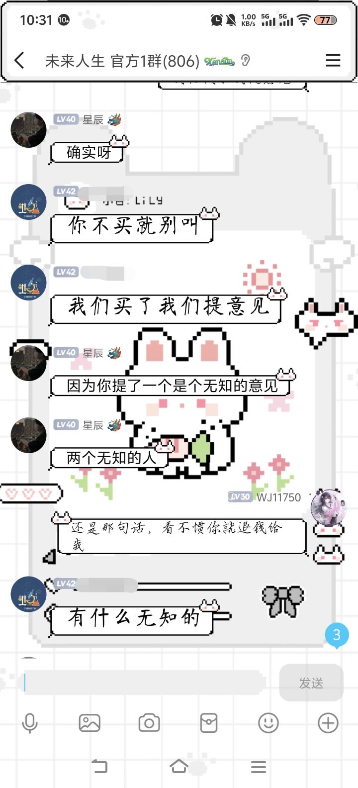 这一次更新很失望,两个新加的玩法都不够完善。通行证这一次权益特别少,而且服装不好看,在群里提出意见,管理不理人,还有人捂嘴不让评价。#未来人生兑反馈 #未来人生反馈 #未来人生 #未来人生问题反馈 #未来人生建议
