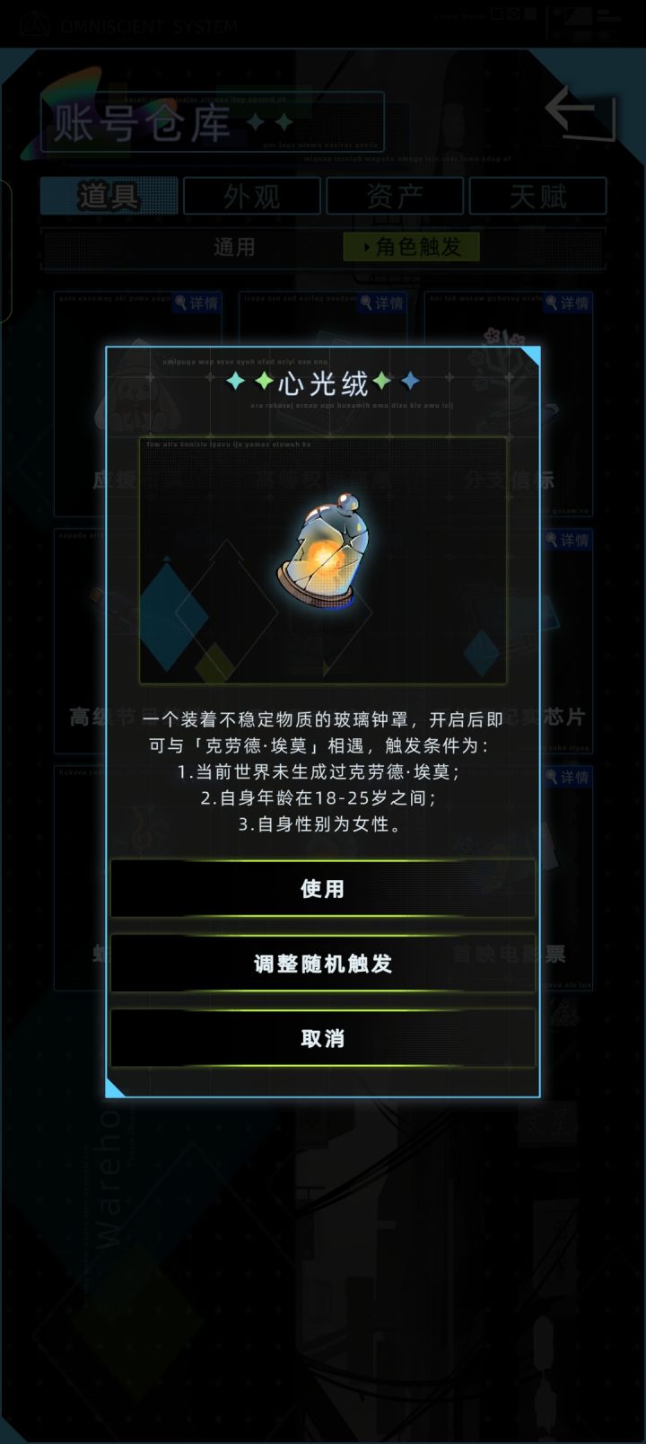 #未来人生问题反馈 事情前提:我已经完成了埃莫的攻略,并获取厄洛斯,已经传了好几代。事件:因为我想要使用重新攻略人物的道具,所以30多岁把厄洛斯送给遗嘱继承人(两三岁左右),之后吃药自杀,但是下一任的主控没有继承到厄洛斯,而且在这个主控(两三岁)的档使用那个网状的道具后并没有碰到涂山。涡虫回收管不到厄洛斯。问题:1.厄洛斯没了。2.使用道具后并没有碰到涂山。