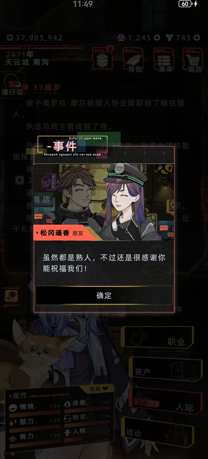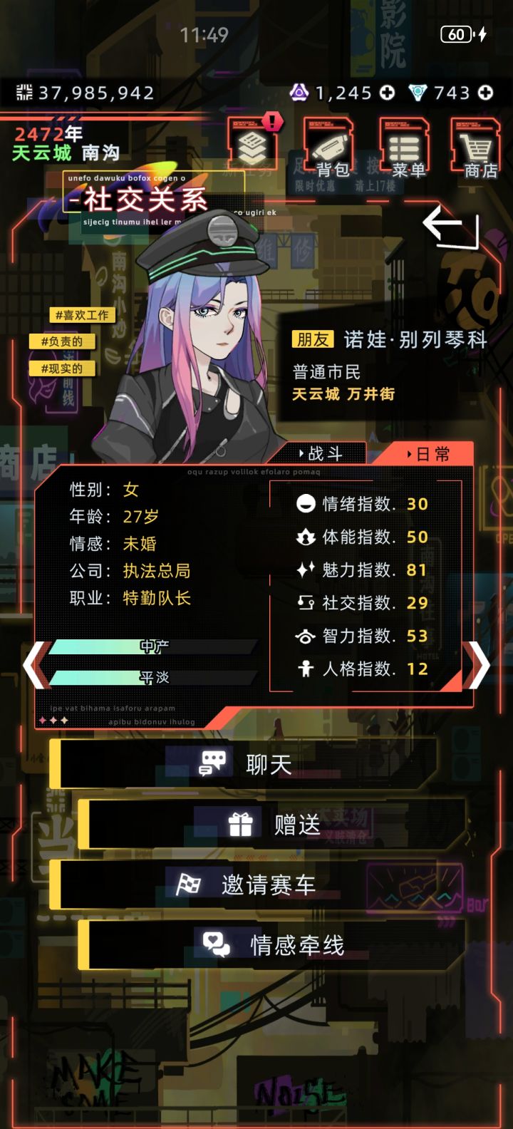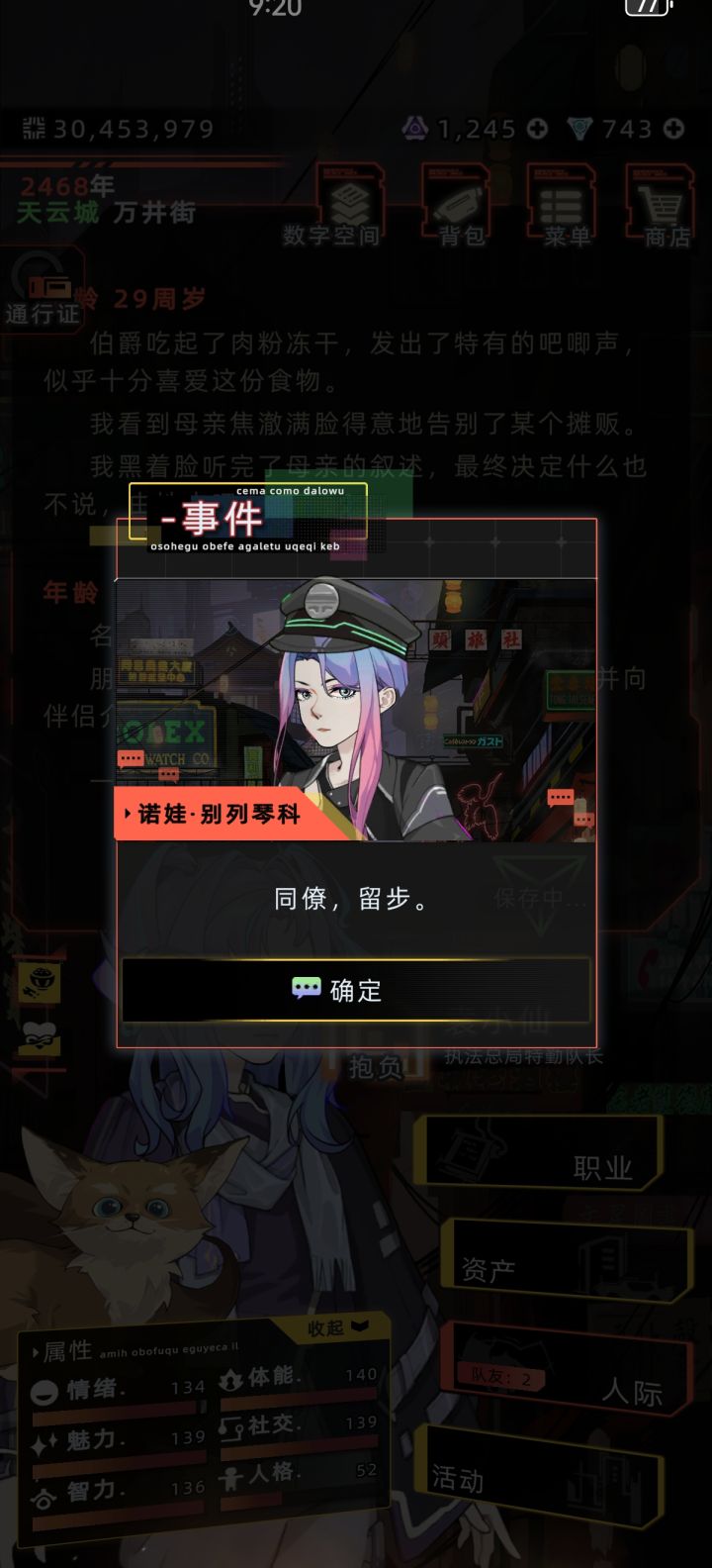 诺娃出现后发现不对劲,一看头发缺了一块,然后我又在执法队找了俩人交朋友然后撮合了,结婚之后的对话女的后脑头发显示也有问题,极有可能每个戴执法帽的女npc都有问题。而这些直到新春前的都还是正常的。