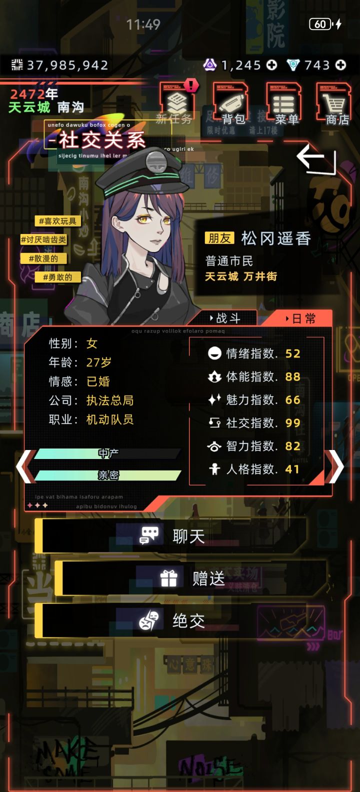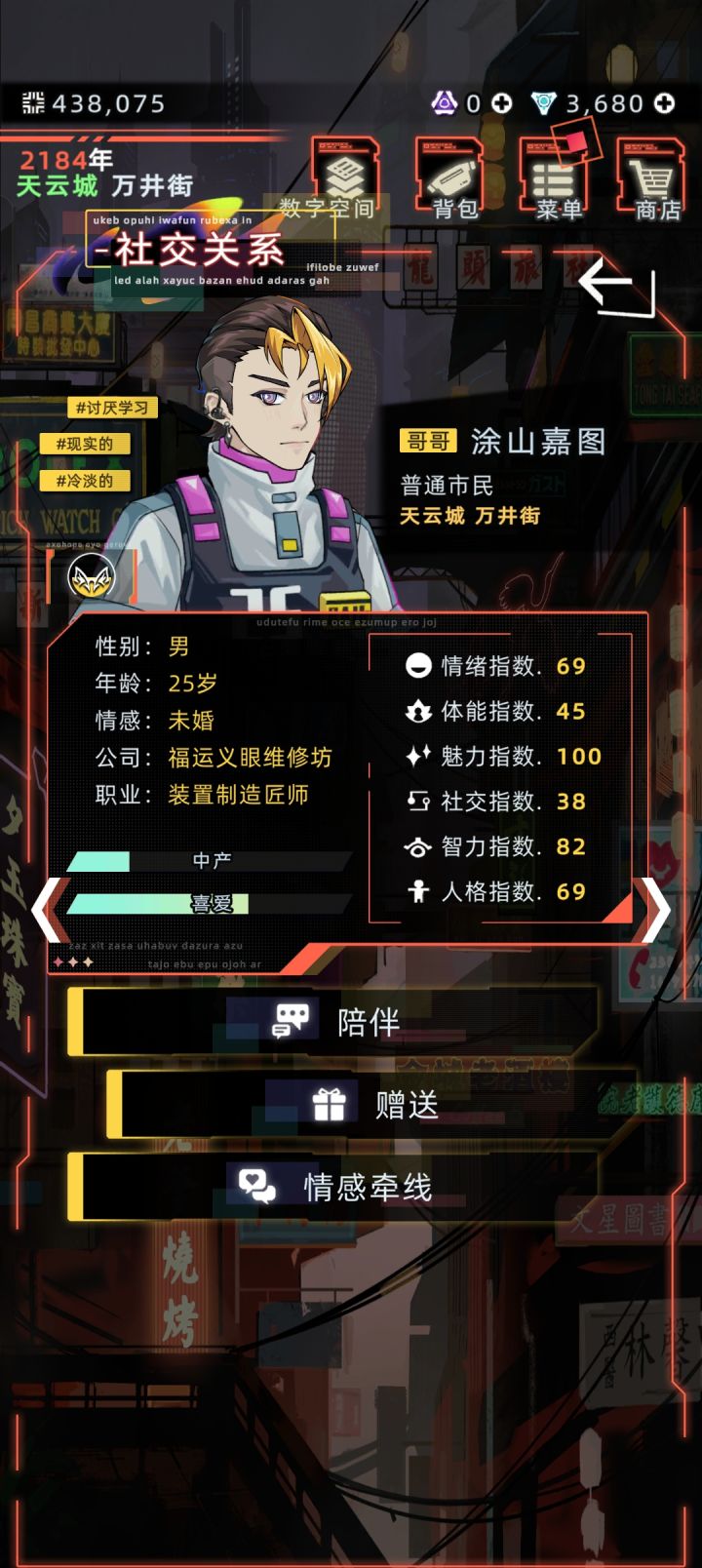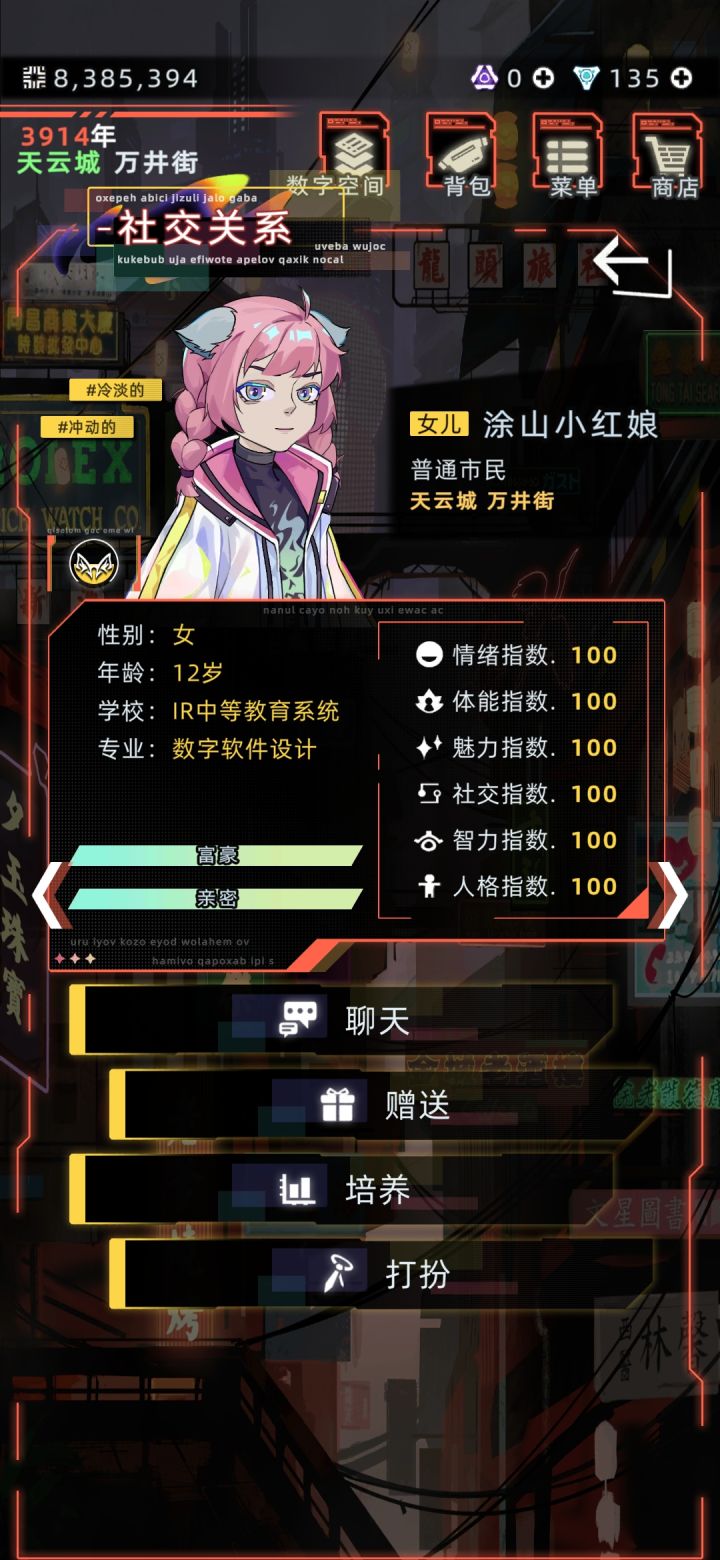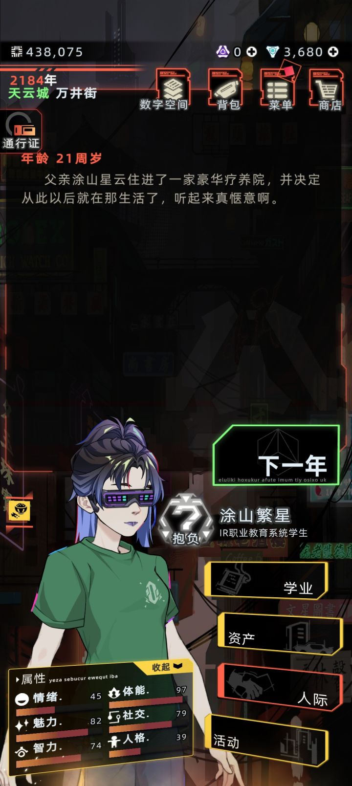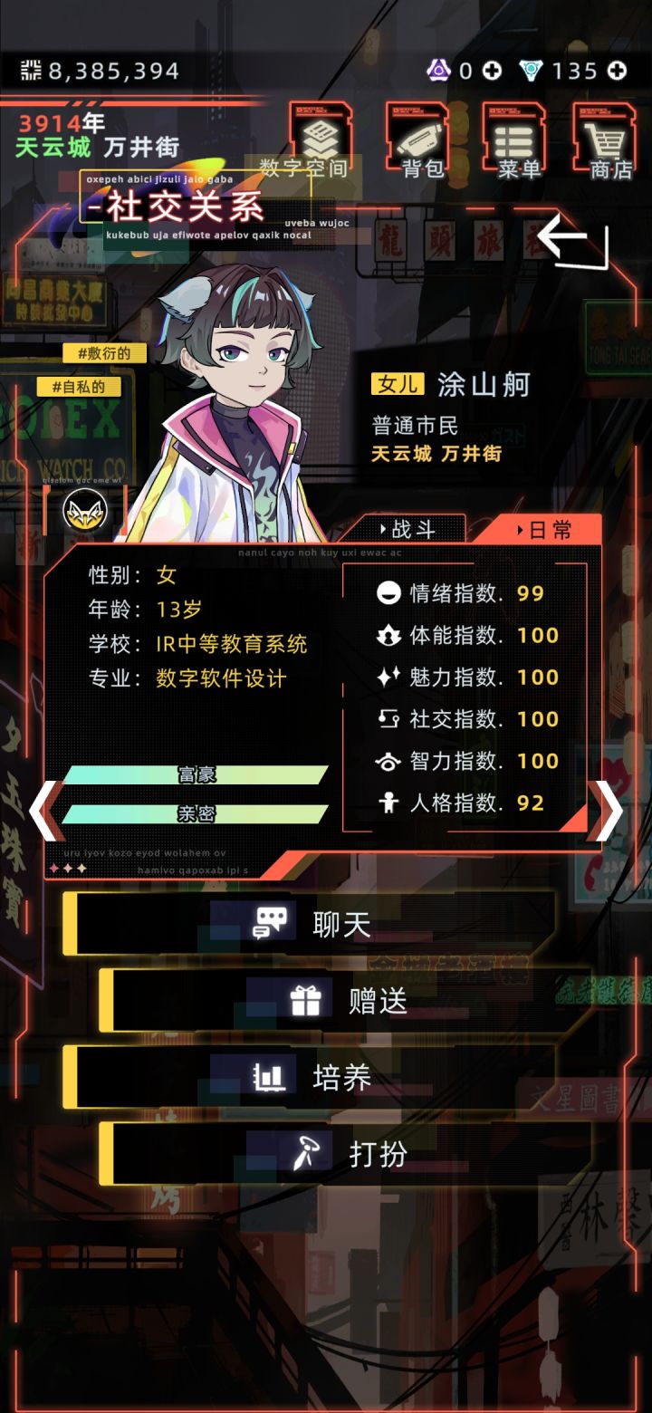 #发现好游戏 建议可以参考一下小偷模拟器,出一个盗窃职业,或者是彩票站,感觉再加一个恶臭值,每年需要洗澡啥的,更加让玩家代入进去。感觉和家人的互动太少了,建议增加一下互动内容。还有就是感觉人物寿命还是太短了,都未来世界了,没有一点增加寿命的科技药物啥的吗,而且武器已经很久没有更新过了,而且感觉近战武器就像是个摆设建议增强一下近战武器。还有购买物品可以增加一下砍价功能,要不然社交有点感觉就跟摆设一