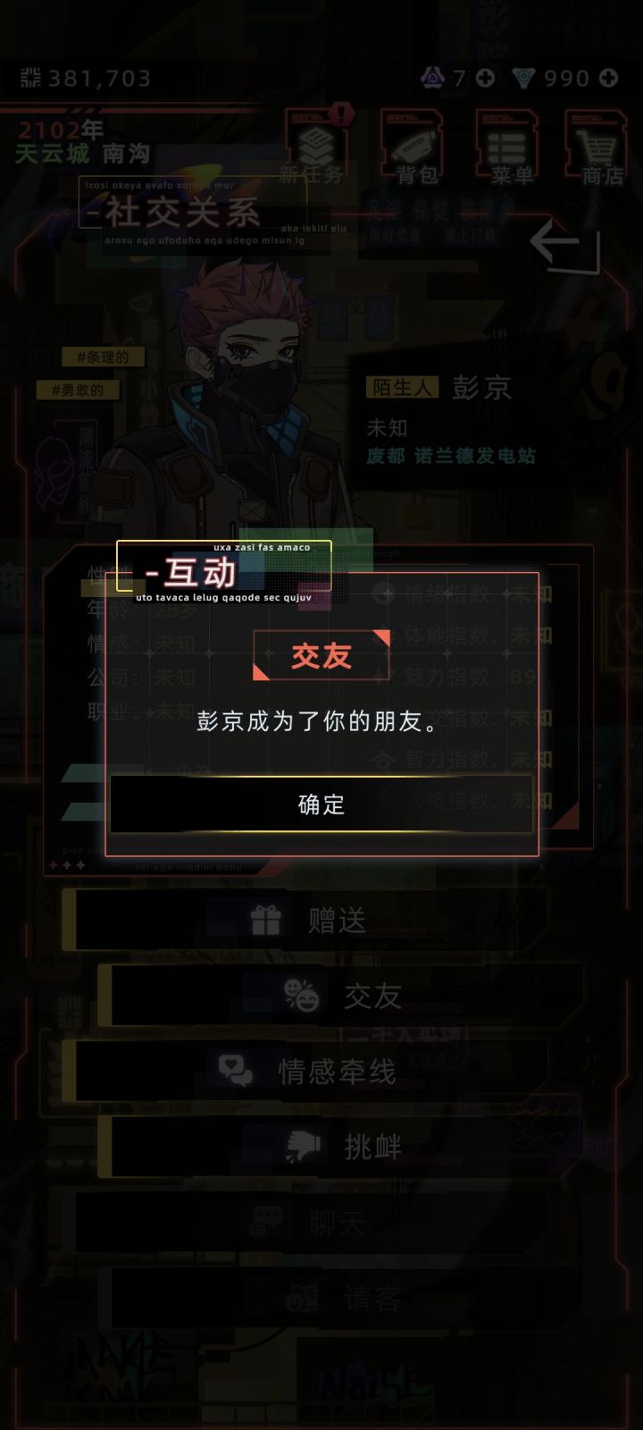#未来人生反馈 这是何意呢?打完怪他就弹出这个点,还点不下去,好感已经很高了,而且交友也显示成功交友了,但是朋友见面就是没有,我在做破晓拉人的那个任务,现在根本就是拉不了