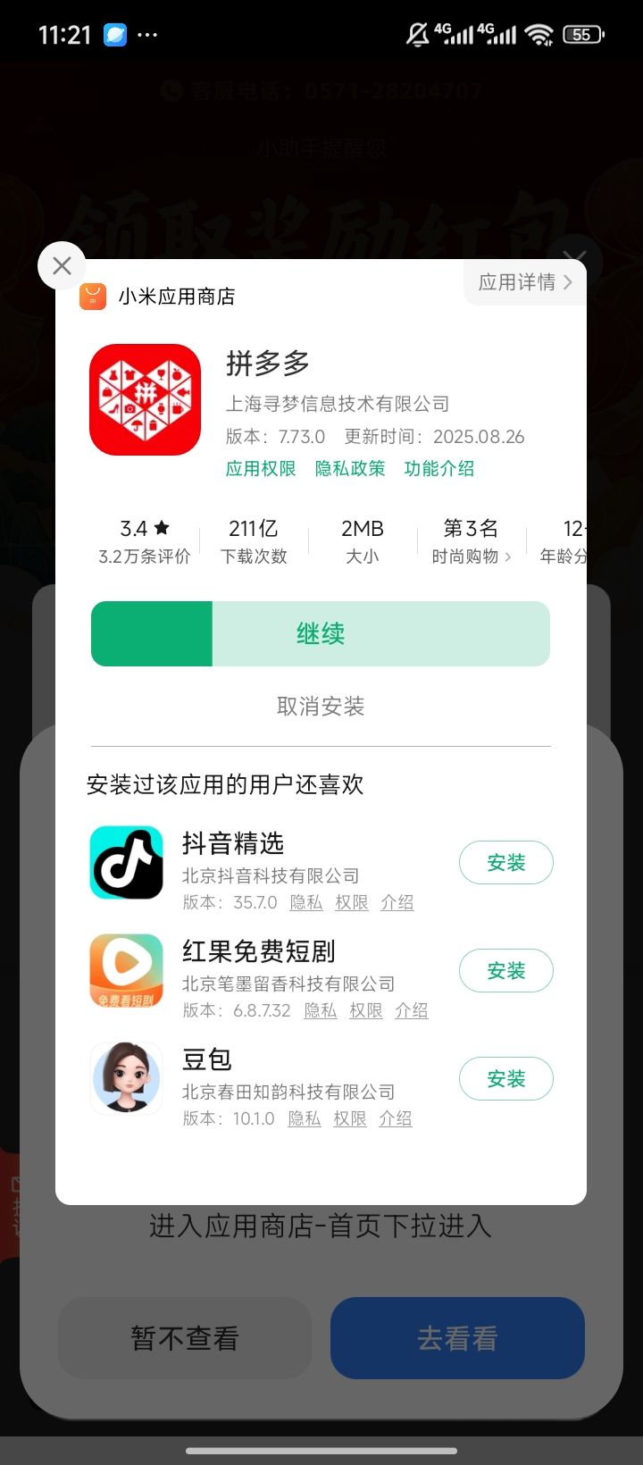 服了,每次广告都是同样的,刚看就给你卡住,只能选择点击进入那个应用或者退出,一进应用就自动下载这个拼多多