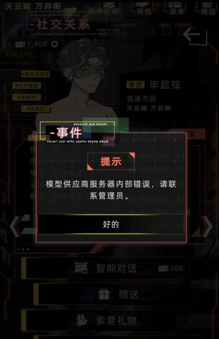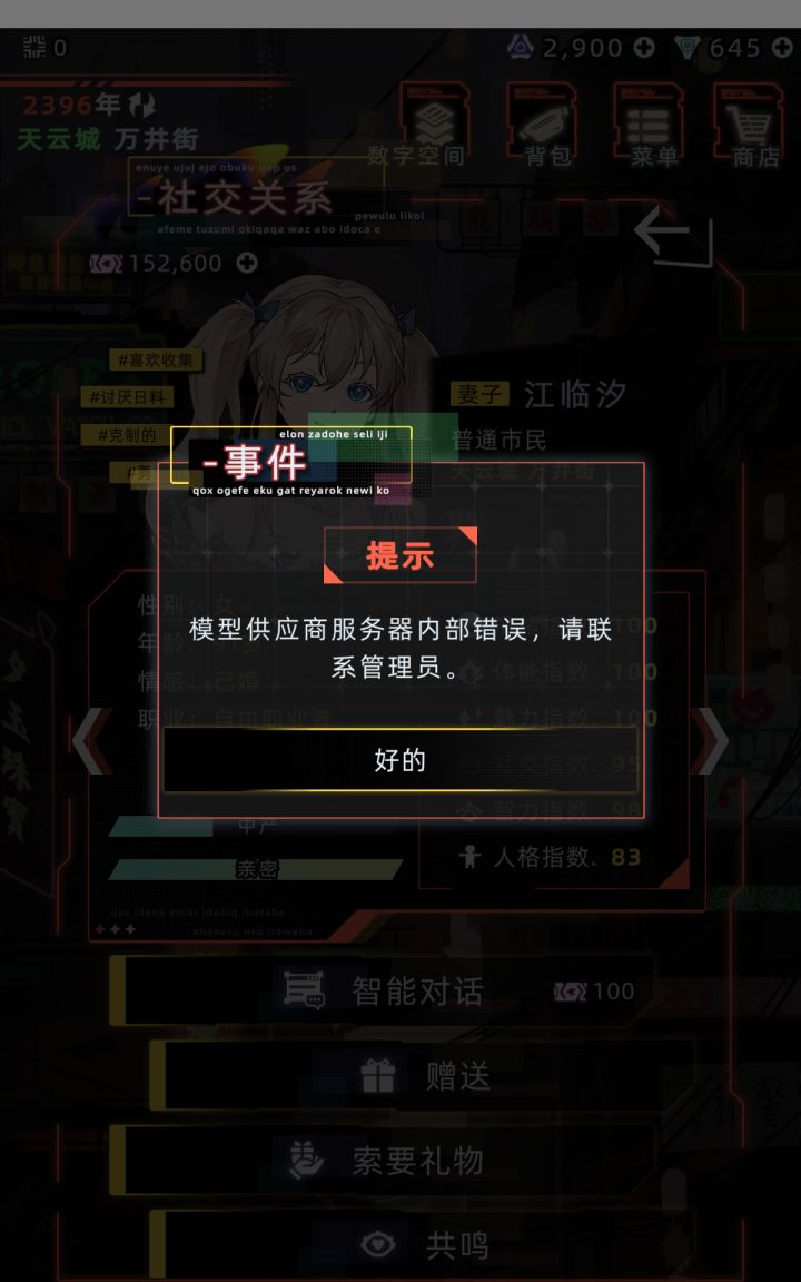 #未来人生 #bug反馈 情况就是上面,我没有办法进行智能对话了,无论对话的人物是谁,他都会在那里一直思考很久这个然后不弹选项出来,这是什么问题?有人跟我一样吗?我试过开飞行模式,再重新联网也不行。#浅评一下 #bug反馈 #未来人生 制作组你快看啊!!!