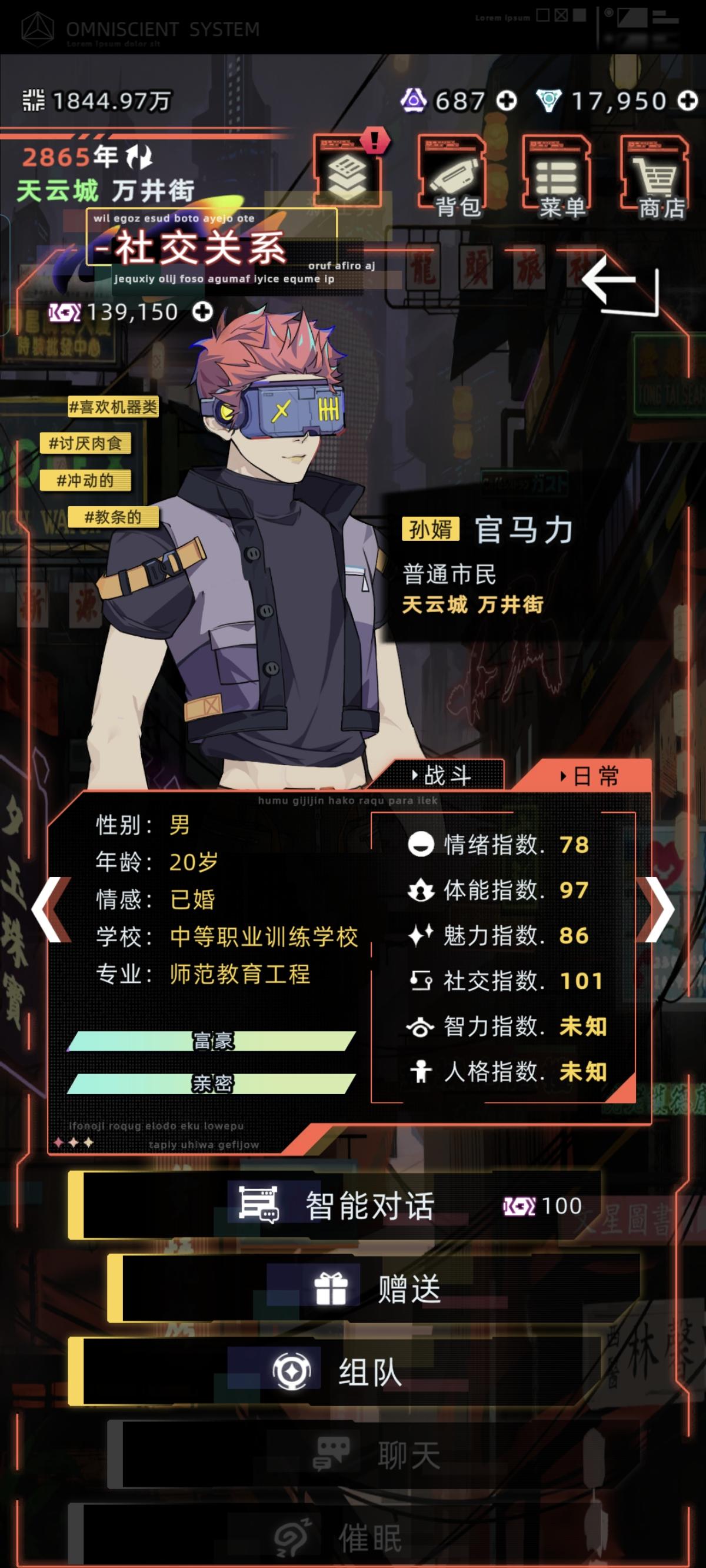 之前是狡猾,但我洗掉了,资产可以看到怎么人格和智力还是看不到。满好感聊天、送礼也不解开