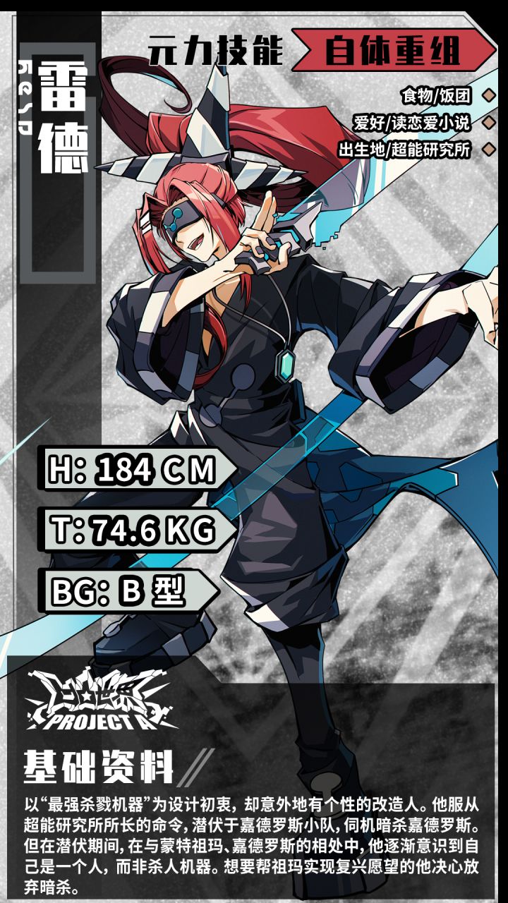 〈9022号大赛资料库相关权限已解锁,是否确认读取?〉〈读取指令激活……Loading……〉〈参赛者·雷德 基础资料读取成功!〉======================雷德,以“最强杀戮机器”为设计初衷,却意外地有个性的改造人。他服从超能研究所所长的命令,潜伏于嘉德罗斯小队,伺机暗杀嘉德罗斯。但在潜伏期间,在与蒙特祖玛、嘉德罗斯的相处中,他逐渐意识到自己是一个人,而非杀人机器。想要帮祖