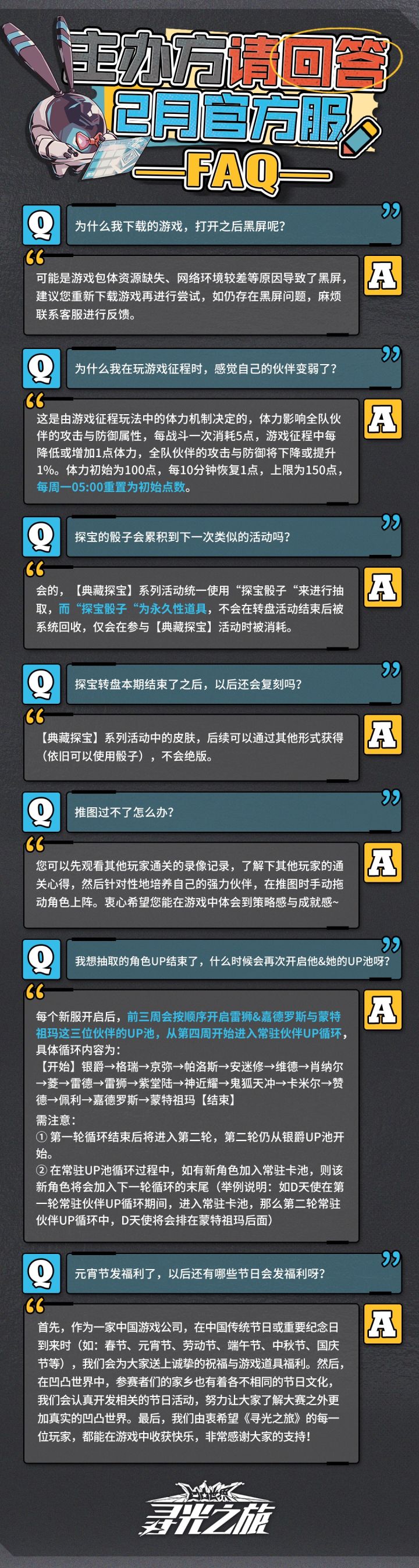 ▷主办方请回答-官方服FAQ9022带来了2月份主办方请回答!下载后游戏黑屏、典藏探宝的骰子是否永久、探宝皮肤会绝版吗?还会有哪些节日发放福利……参赛者们关心的问题,主办方进行了回答,一起来看看吧!若参赛者对游戏有其他反馈,可联系官方客服进行咨询!相关问题解答请戳下方>>