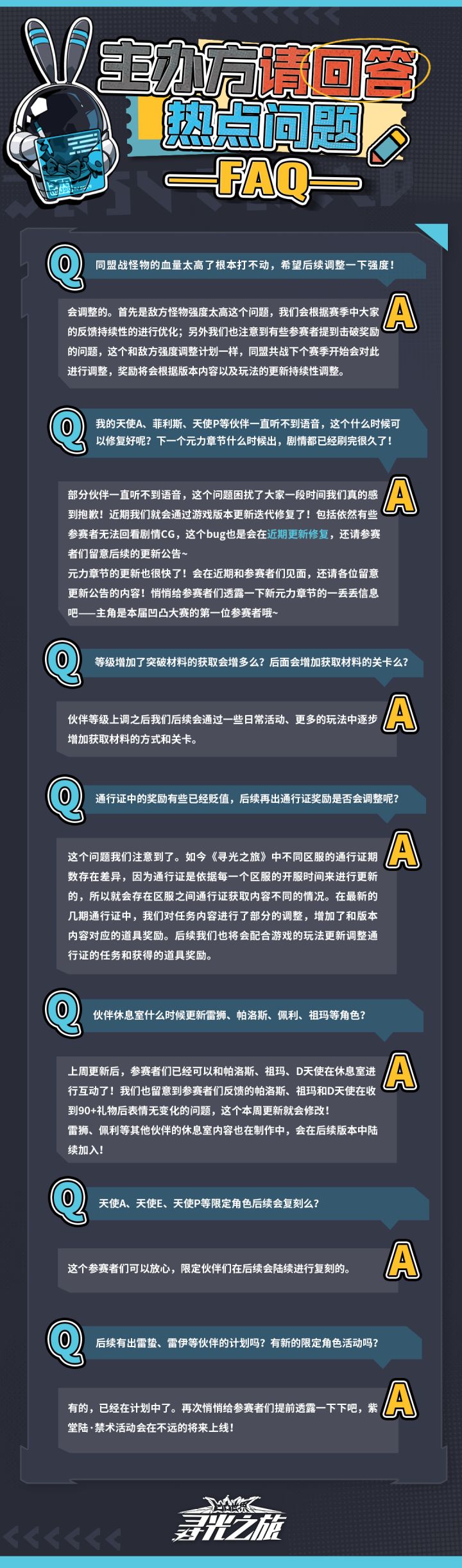 ▷主办方请回答-FAQ新一期的主办方请回答出炉!同盟共战怪物强度太高、天使A菲利斯等伙伴听不到语音、下一章节元力剧情什么时候推出、限定角色后续是否会复刻等等反馈和疑问主办方作出了答复,一起来看看吧!