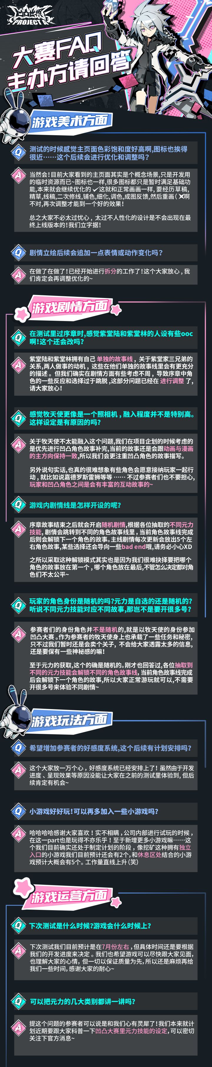 9022带来了第一期主办方请回答!紫堂陆与紫堂林故事线会改吗?剧情线将会怎样开设?主页面与剧情立绘还会优化吗?好感度系统是否会安排?下次测试什么时候?经过第一轮的反馈收集,那些参赛者们所关心的问题,主办方进行了回答,一起来看看他们怎么说吧!★大赛主办方★官方2群:922948619官方3群:421930021
