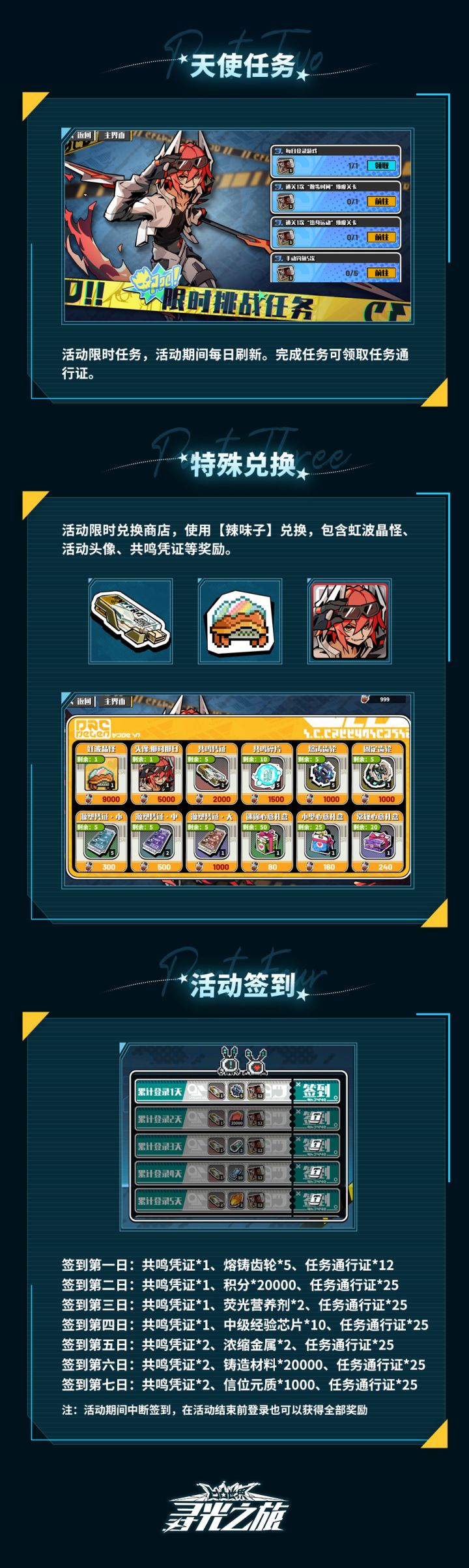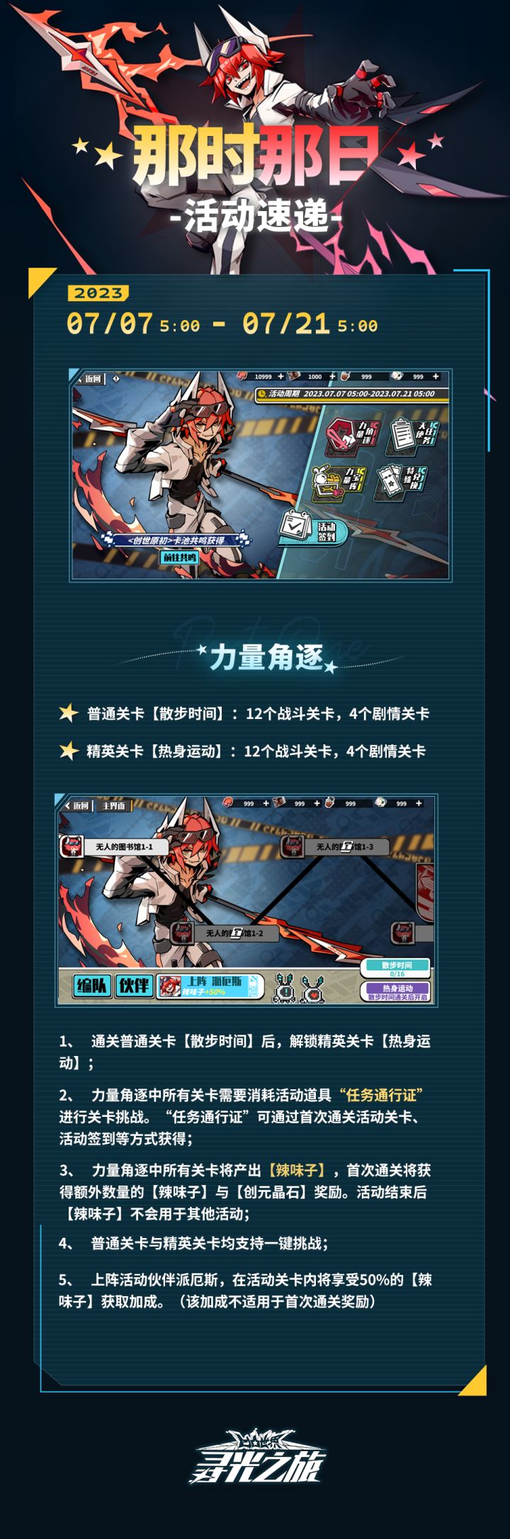▷主办方活动速递★天使P-【那时那日】活动即将开启!活动期间,【力量角逐】剧情关卡开启,限定橙卡伙伴【派厄斯】限时up!★【天使任务】每日刷新,完成任务获得任务通行证!★活动限时兑换商店凭【辣味子】可兑换虹波晶怪、共鸣凭证、活动头像等奖励!★七日【活动签到】每日刷新,可得共鸣凭证、任务通行证等奖励!详细活动速递点击长图>>>============================※关