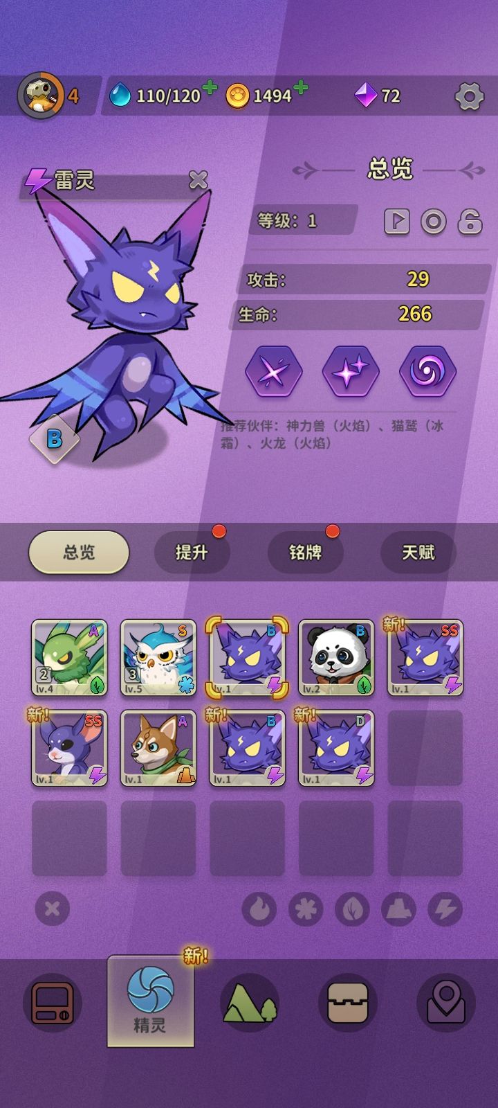 开始之前说个题外话,这游戏没有绝对完美的阵容,阵容搭配上更多的是看你获得的第一个主c精灵是什么,再根据技能特性进行搭配,毕竟游戏培养资源(主要是天赋书和铭牌)获取上还是有一些难度,如果随便找个阵容,培养起来,后面要换怕是得苟很久才能。所以下面推荐的也只是个人目前正在使用的阵容,供参考研究,如图 个人目前使用的阵容:暴力牛+风岩羚+雷煞理由:暴力牛二技能起手推怪到中排,且附带沉默,配合火系精灵