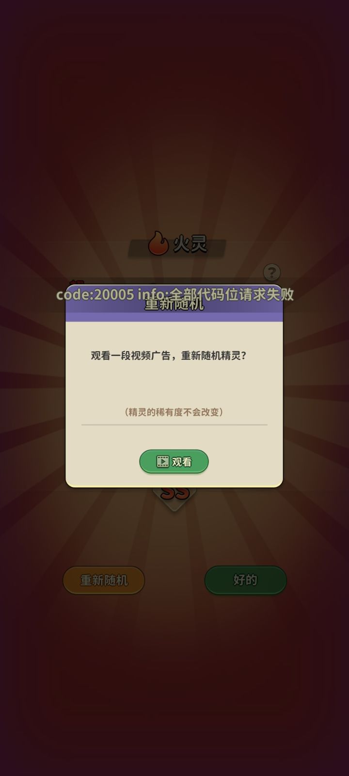 3. 多次遇到广告无法正常观看的情况,显示“code:20005 info:全部代码位请求失败”,立即重启游戏亦无效,须等待一段时间才能恢复;