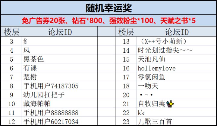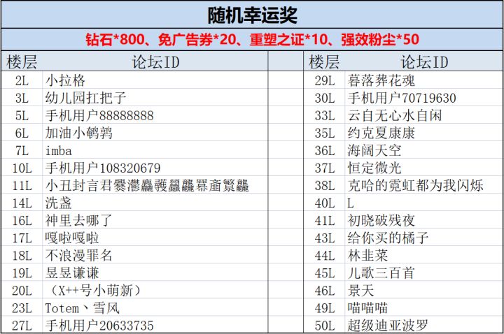 感谢大家积极参加我们的上周的论坛小活动,话不多说,马上来看下本次活动的获奖玩家吧~随机数结果如下:恭喜以上玩家获得本次活动的幸运礼包:钻石*800、免广告券*20、重塑之证*10、强效粉尘*50。请获奖玩家在2022年6月29日中午12:00点前,联系客服QQ:2851702376(在线时间:工作日9:30—18:30),提供游戏uid、回复内容和带有回复楼层数的截图。奖励会在6月29日1