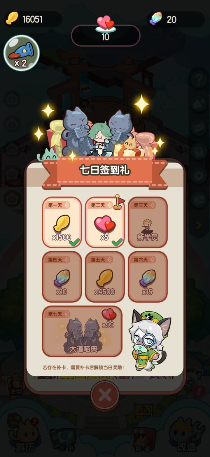 游历时间无上限无法结束新手任务或者说教程衔接不够顺滑,让人中间会觉得不知所措,帮助中心里对人气值的解释也只有买家具,不是所有人都会玩游戏之前看一下攻略的。还会偶尔卡死游戏内容和游戏名字可以说基本没有明确的关联被名字和画风吸引进来,现在已经不想碰了。希望能有改进#策划听我说