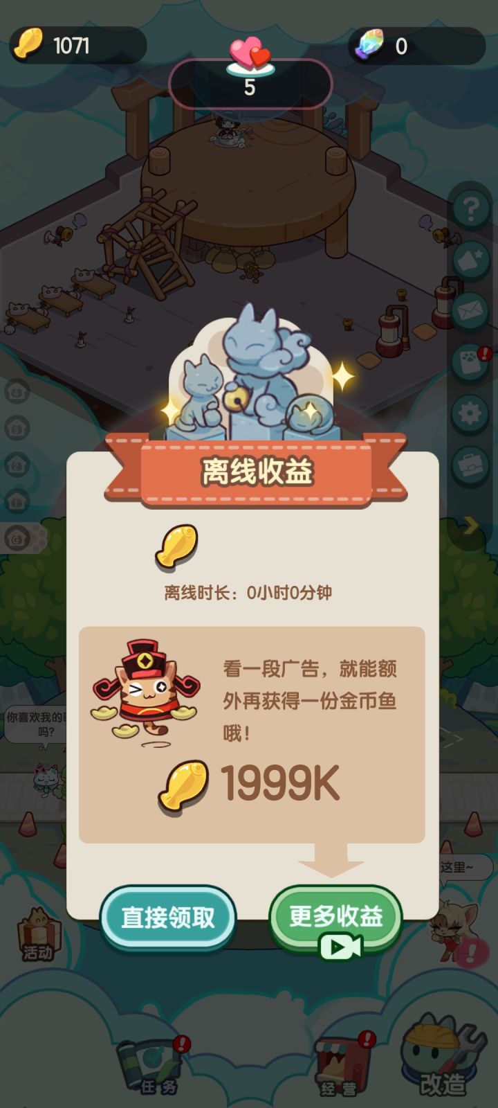 第二次登陆就一直在离线收益页面卡住,两个按钮都点不了,重新尝试好多遍也不行。🙀