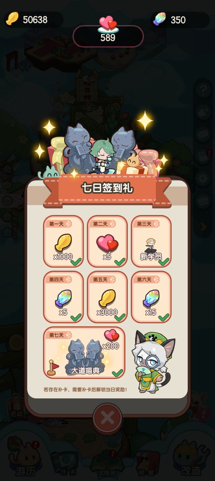 刚上线弹出签到界面 领取不到 关了再次进去显示已经“✓”了但人气没变化 这个大道喵典是什么也没看到在哪😭