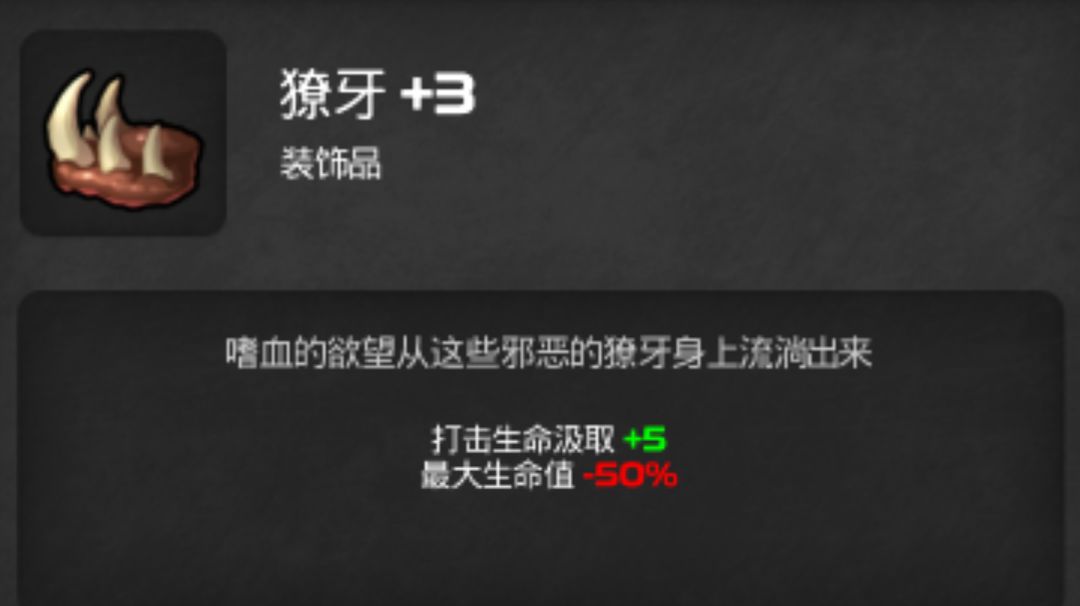 小玩意儿介绍:扣50%最大生命值(满级),吸血方法按攻击伤害比吸血(伤害越高吸血越多) 技能:精力充沛、战士、医生. 特殊商品可以任意搭配 . 小玩意儿搭配:獠牙(核心)、能量包、手绷带、平衡锤、狂暴魔咒(除核心其他可以任意搭配. 主要武器推荐:神力拳头、镰刀(高配)没有的可以用自己最高伤害的武器(除鱼杆,铁锹). 服装推荐:摩托头盔、短茄克杉.(有什么不对的可以说,请文明用语谢谢!🙏🙏🙏