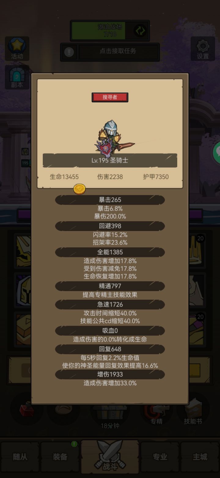 防战打的,很安逸,一开始用的190套加吸血匕首和190盾,老一打得很慢全靠天赋伤害反弹,出了辉耀盾后快了非常多,重点就是满回避满急速其他全部全能,因为刚玩披风还没出来