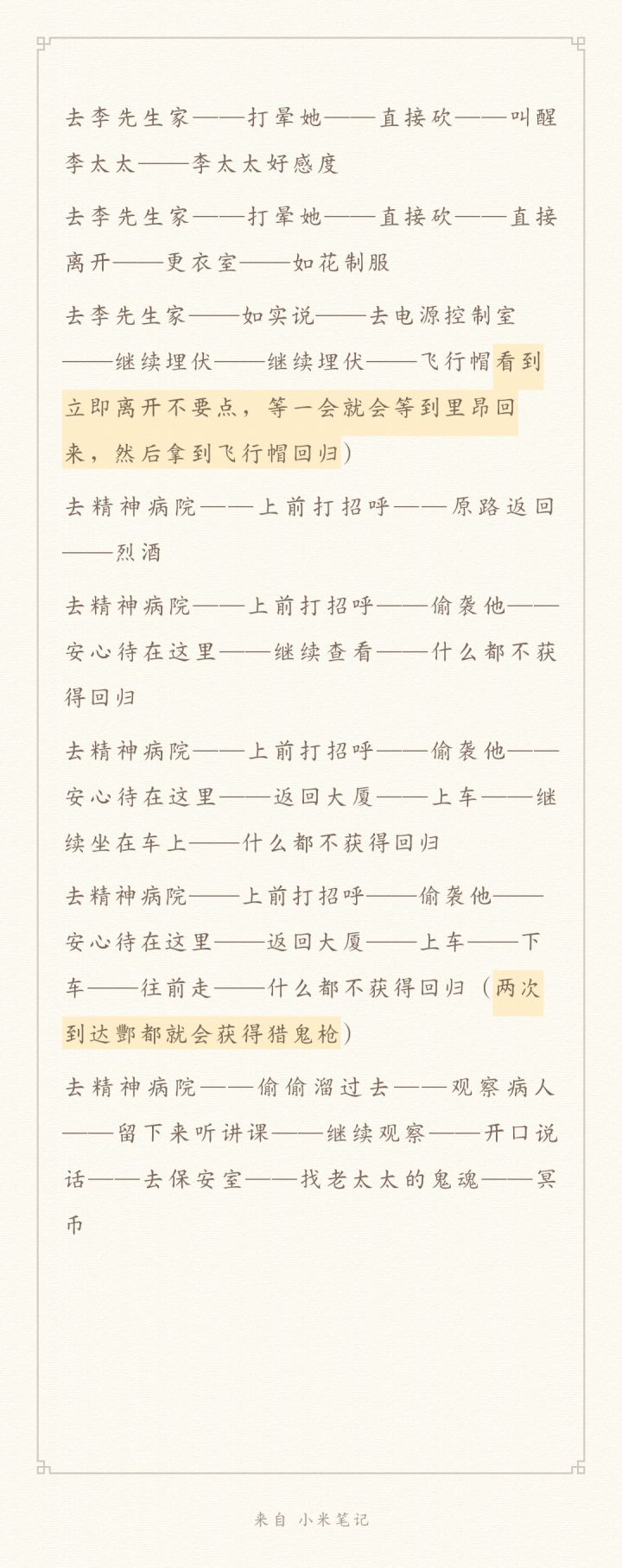 不要找两次猫,门开不起床查看,探查屋外不要去二楼,饿了不要出去找吃的,去了佛寺没得佛经只能赖在那,去找受害人先要去佛寺得到佛经,没有收集受害人不要主动找伽椰子,未在鬼宅待一晚不要直接去警局。
