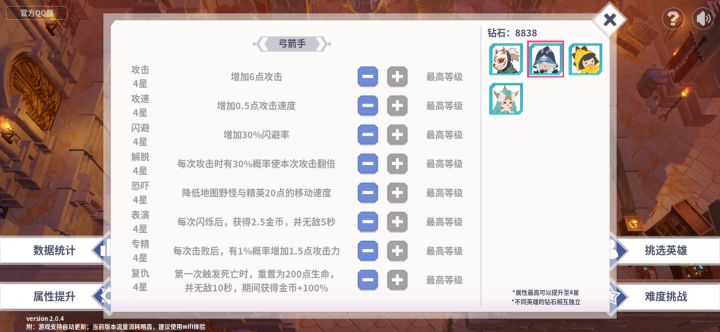 @李鼎天发现一个bug,选择弓箭手,退出游戏,到开始界面把英雄换成第一个角色,点继续游戏,角色没变,但背景变了,同时打完之后给的砖石是给第一个角色的。至于给的技能那些有没有变不清楚,刚开始玩