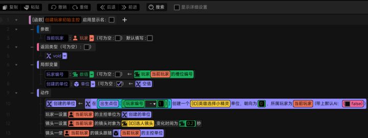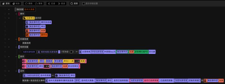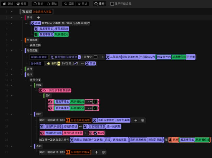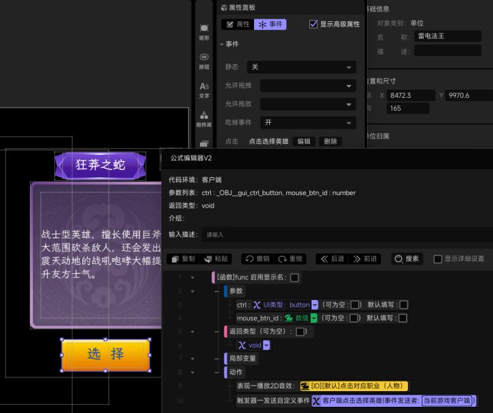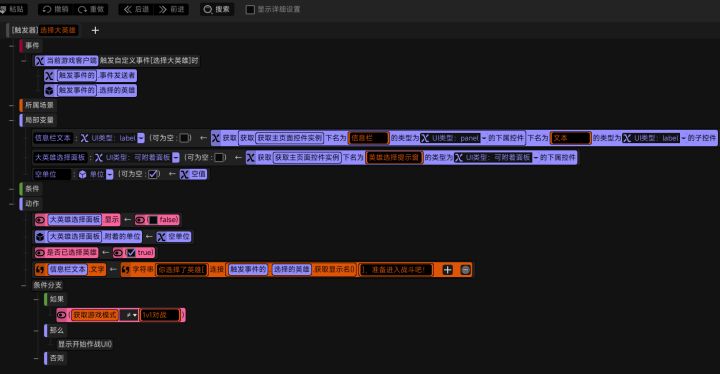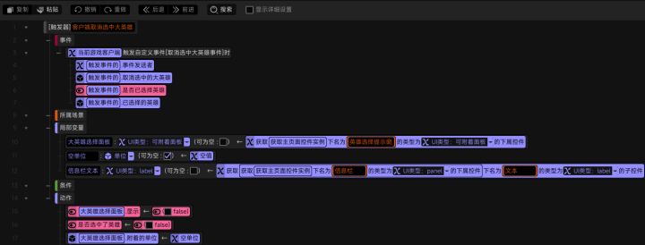 #星火编辑器 #星火编辑器入门 我正在尝试使用『星火编辑器』制作一款卡牌游戏。 接着上一期,我们来到这个功能的客户端部分。当玩家选中英雄,服务端将选中大英雄事件发送给客户端,并且在事件中将三个参数——选中的大英雄(单位)、是否已选择英雄(布尔)、已选择的英雄(单位)传给了客户端。那么我们找到上一期所创建的可附着面板,并将可附着面板中的控件在局部变量中进行声明(P2) 接着设计我们要选择的
