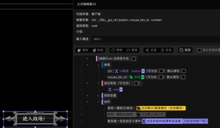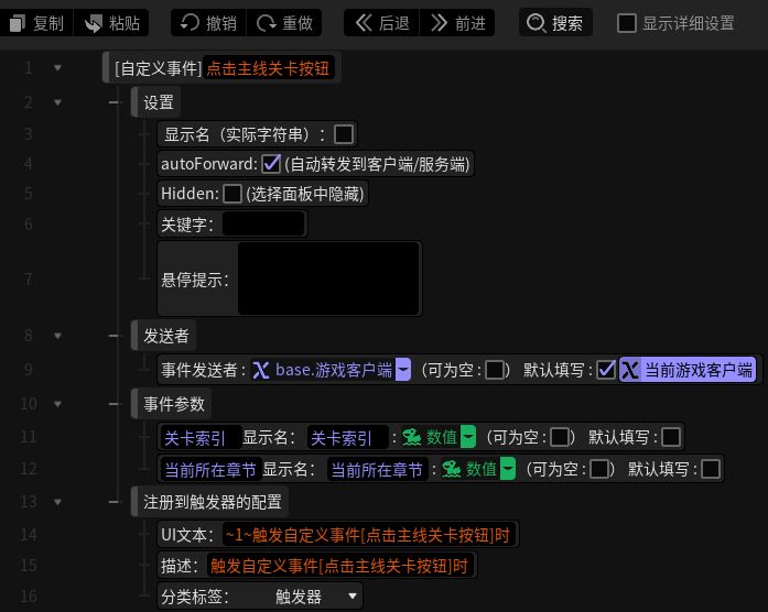 #星火编辑器 #星火编辑器入门 #星火编辑器小功能分享教程 我正在尝试使用『星火编辑器』制作一款卡牌游戏。 在前面几期,我们完成了主线选关功能的设计与制作,并且添加了提示消息滚动条的UI交互功能。今天继续平稳行驶,完善玩家从开场到进入主线选关界面过程中所需的触发器和方法。 点击关卡按钮的事件已经有了,我们还要为进入关卡的按钮创建对应的点击事件(P2) 新建一个为进入关卡按钮创建点击事