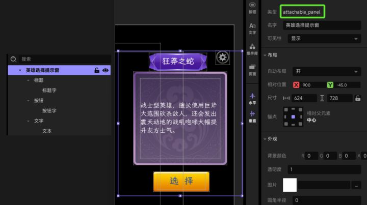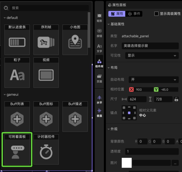 #星火编辑器 #星火编辑器入门 #星火编辑器小功能分享教程 我正在尝试使用『星火编辑器』制作一款卡牌游戏。 在前面分享的功能中,我们已经可以让玩家选择一个主线关卡并进入跳转界面。今天接着上次的思路继续,制作玩家进入主线关卡后要跳转进入的选人界面。 还是先从界面设计开始。今天要尝试的新面板是“可附着面板”。我们打开界编组件库,从gameui中找到“可附着面板”(P2)/*科普-可附着面板
