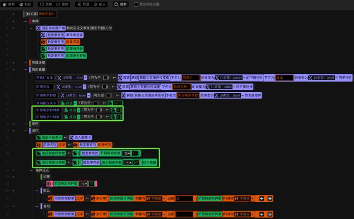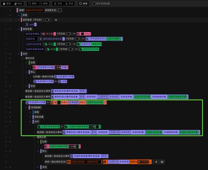 #星火编辑器 #星火编辑器入门 #星火编辑器小功能分享教程 我正在尝试使用『星火编辑器』制作一款卡牌游戏。今天我们接着上一期继续进行游戏阶段相关的触发器编写。当完成了计时器当前阶段读秒的方法和切换阶段的方法后,要用一个触发器处理阶段结束时程序需要做的事。当阶段结束时,触发器除了要执行服务端的方法外,也要向客户端发送不同的事件指令去让客户端执行和玩家相关的客户端触发器。那么话不多说,直接开干。在