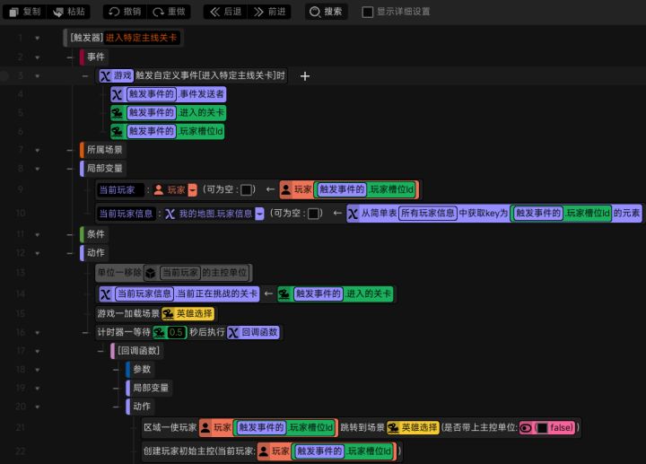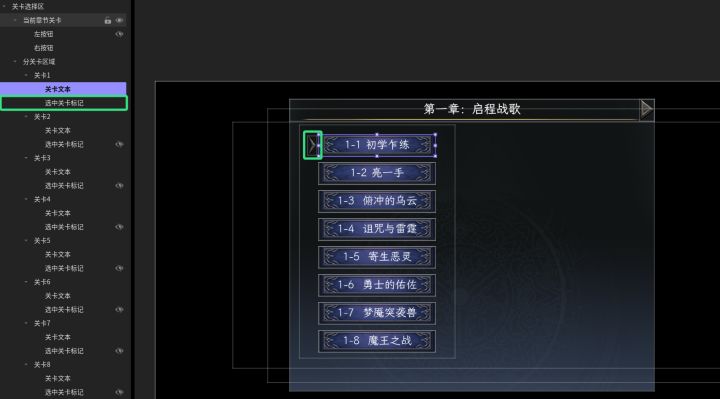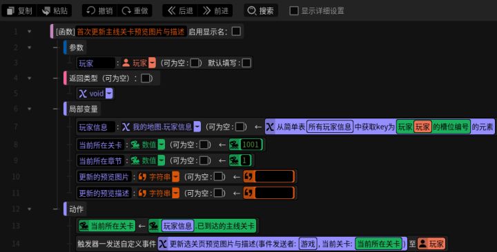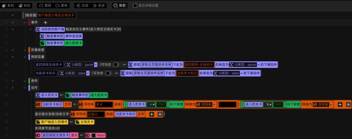 #星火编辑器 #星火编辑器入门 #游戏ui界面 #星火编辑器小功能分享教程 我正在尝试使用『星火编辑器』制作一款卡牌游戏。上一期我们完成了触发器批量实现关卡按钮点击响应的功能(P2),今天让我们继续完善主线选关界面功能。当玩家点击特定关卡的按钮时,要让程序知道玩家点的是第几个关卡的按钮,根据当前玩家所在章节计算出玩家点击按钮所对应的关卡,从而为玩家更新该关卡的图片和描述信息。这里需要有一个小