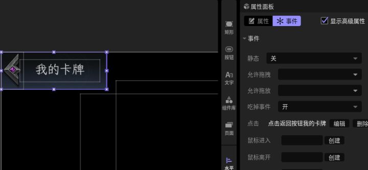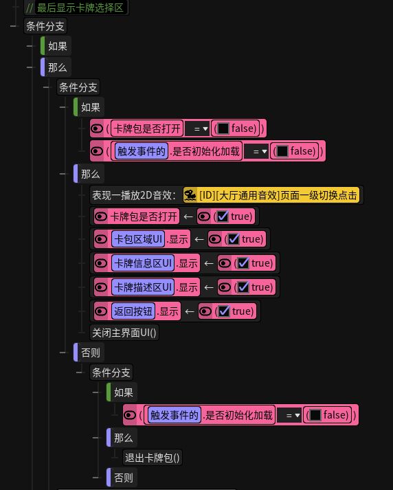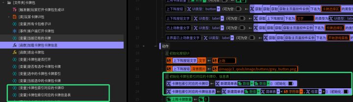 #星火编辑器 #卡牌游戏 #星火编辑器入门 #我的游戏日记vol7 我正在尝试用『星火编辑器』制作一款卡牌游戏。上次我们已经完成了卡牌包框架和UI的搭建,这次我们乘胜追击,在卡牌包上加入用于给玩家将卡牌上场(出战)的按钮。话不多说,我们直接在卡牌显示区下方创建一个上下场按钮的button,并在旁边加上label用于表示玩家已上场的卡牌数量(P2)接下来要为按钮创建一个点击功能。我们在右边的属