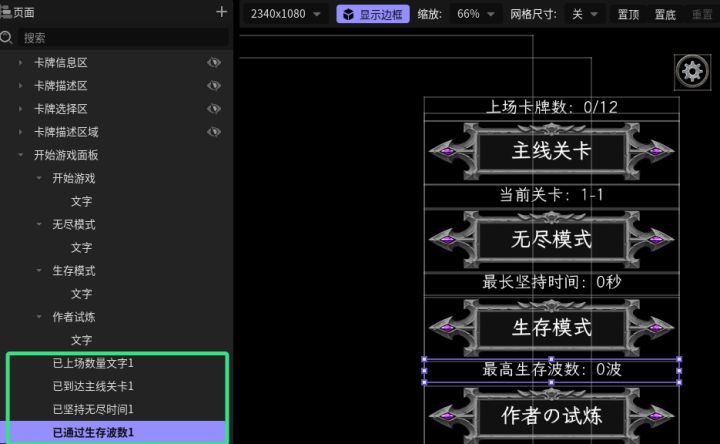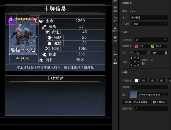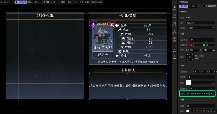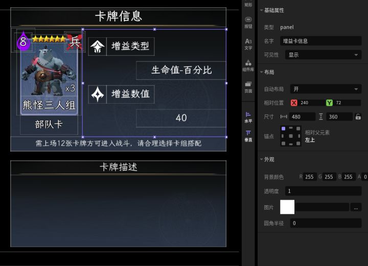 #星火编辑器 #星火编辑器入门 #卡牌游戏 #星火编辑器小功能分享教程 我正在尝试用『星火编辑器』将一张游戏卡牌变成一款卡牌游戏。在前面几期的努力下,我们设计了卡牌,做出了存放卡牌的卡牌包,并且让系统能够根据玩家所拥有卡牌自动在卡牌包内生成卡牌。今天车速稍稍放缓,做一个简单的动态卡牌信息同步功能,让玩家自由查看其选中的不同类型卡牌的详细信息(P2)这里我们还是先在界面编辑器里定位好相关控件的