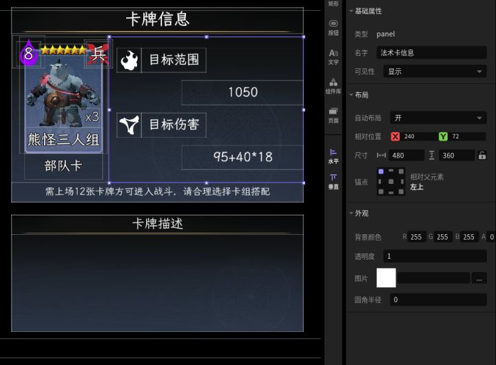 #卡牌游戏 #星火编辑器 #星火编辑器入门 #我的游戏日记vol7 我正在尝试用『星火编辑器』制作一款卡牌游戏。众所周知,要做出一款卡牌游戏,光有一张游戏卡牌是不够的,还要有一个能装卡牌的卡牌包,并且最好要能清晰呈现卡牌信息。以下是我的详细操作——(1)先绘制3个panel框,并在每个框底部配上一个深色的背景,在色调上和卡牌颜色区分。其中左侧的大框代表卡牌显示区,即显示拥有的卡牌;右上的框代表