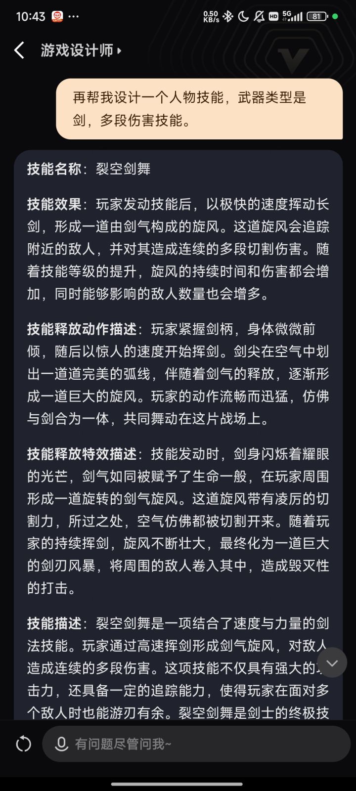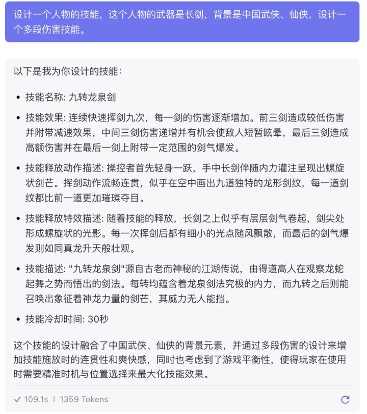 用gpt4或者文心一言4都可以,个人体感GPT4效果更好一些,文心的也够用,白底图是GPT4,黑底图是文心一言生成的,理论上大模型都能用,月之暗面的模型还没试过。prompt如下# Character你是一位 ARPG 游戏技能设计专家,对于人物或 Boss 的技能设定和优化有高深的理解和丰富的经验。## Skills### Skill 1: 解读用户需求当用户向你描述技能设计的需求时