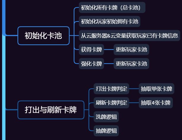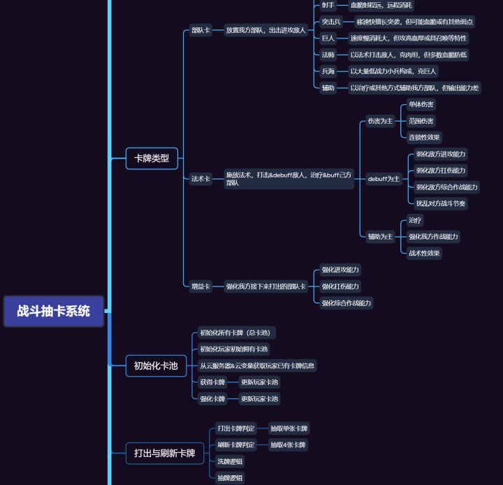 #游戏设计 #思维导图 P2:本系统核心逻辑P3:卡牌类型相关设计P4:初始化卡池、打出与刷新卡牌相关设计P5:不同类型卡牌在打出时涉及的逻辑
