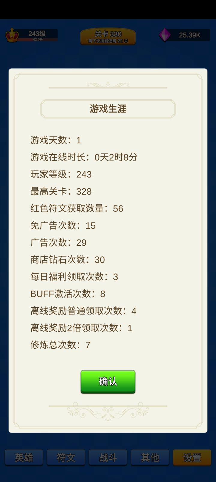 大概算了下,一个英雄满级要20技能点,一个技能满级要10技能点,18满级英雄➕5满级技能也就是410技能点,要推到83846关,一天推个一两百关吧也就,得两年以后了。