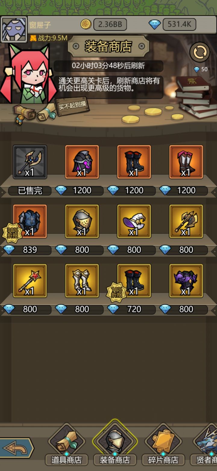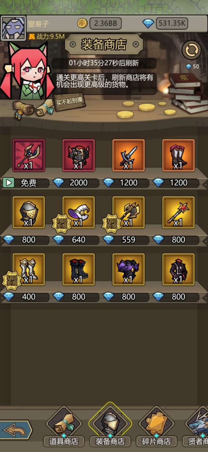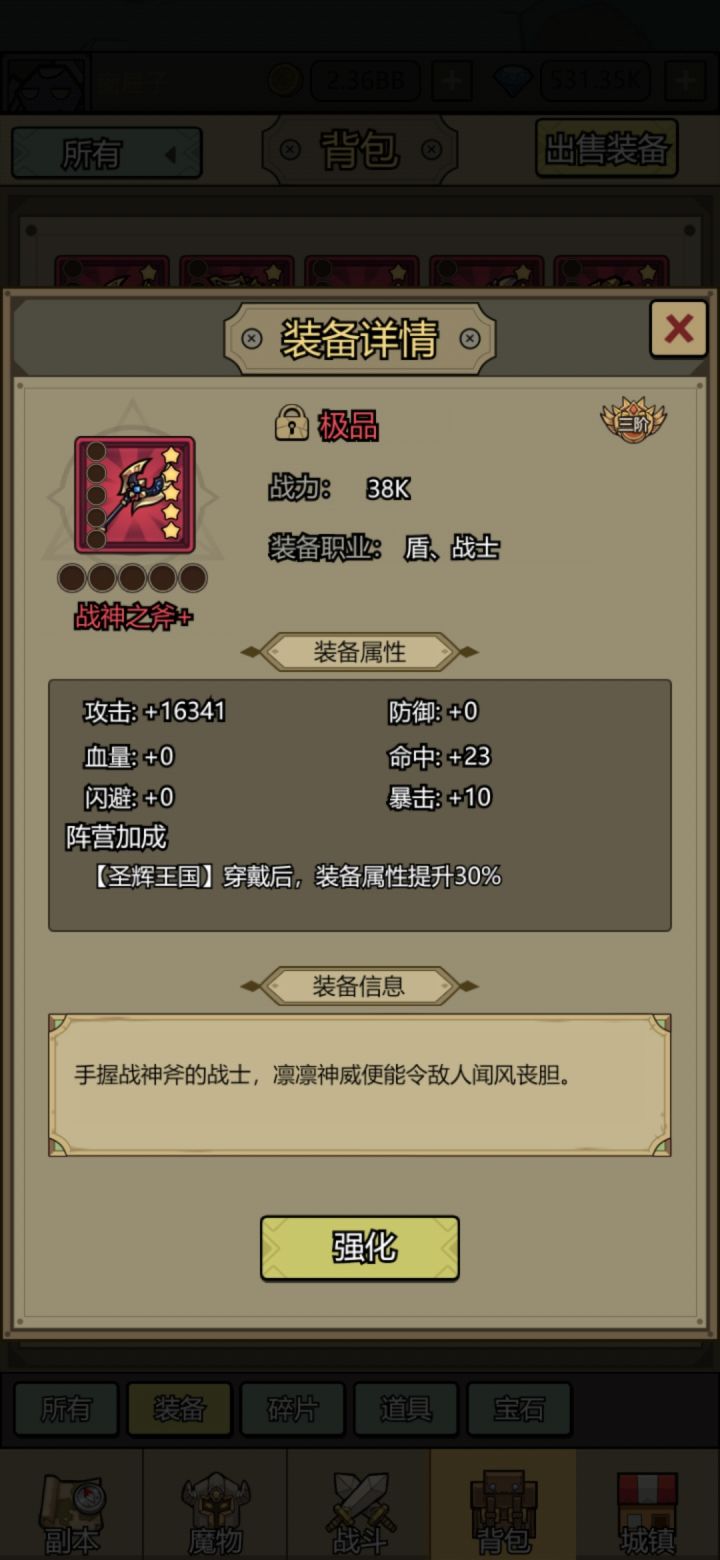 发现一个小福利,刚开局的萌新很有用,流浪商人的装备商店中,可以通过看广告拿到价值3000钻的极品装备,每天刷新三次, 比如下图这把战士斧,升到五星有1.6万攻击,刷一个阵营相符,攻击达到2.1万,对初期没打到850关之前很赚!!!