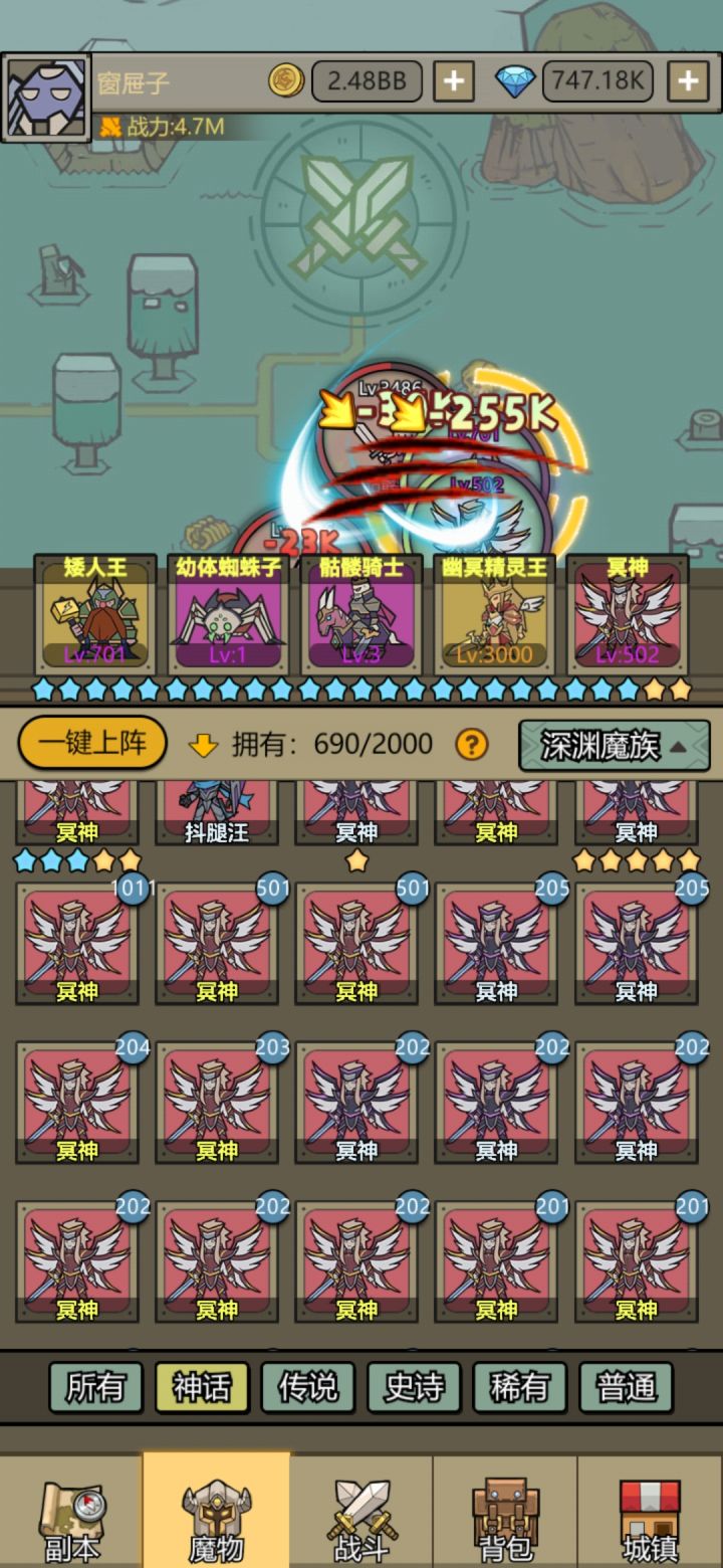 先讲3000关,为什么是道分水岭,我个人把它称为这个游戏的大前期,3000关后怪物有百分比免伤,百分比伤害技能很吃亏,3000关前:五个5,6星好一点最佳配置阵容基本上愿意手动推的话可以推过(我目前见过最低的战力1.6M打过3000关,高星裂开猫🐱或冥神和高星盾,加个蜘蛛子控),3000后基本需要沉淀时间升星,弄魔物羁绊(图书馆里面有)去推塔,弄完3000塔后就可以弄转生了。《目前最多关卡8000