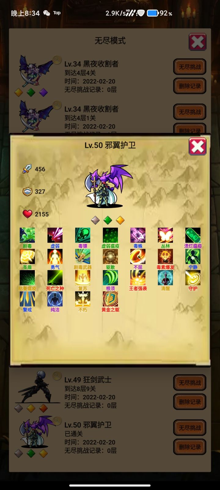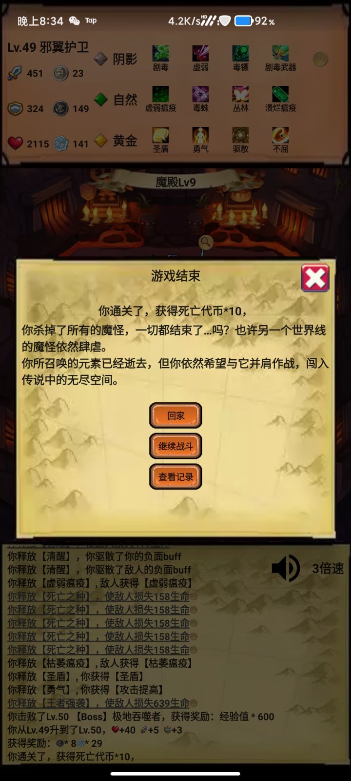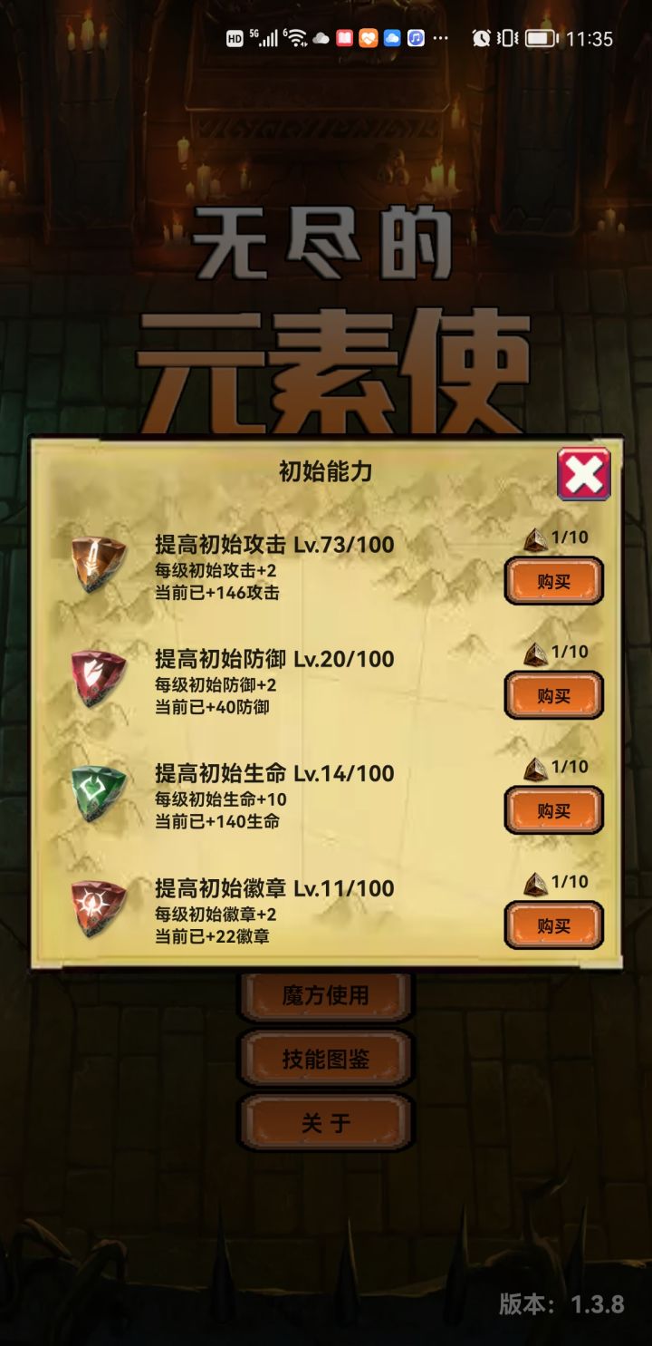 游戏有3大徽章:白、黑、蓝分别对应游戏的10大元素:白色:阴影、战争、黄金黑色:机械、恶魔、灾难蓝色:光芒、自然、魔法、幻觉普通模式最多可以获取3种元素以及5种技能如果中途拿了2元素5技能,想获取第三种元素,它会自动删除一个升级最少的技能如果中途拿了3元素5技能,想更换其中一种元素,它会让你选择替换哪一项元素的当然,你也可以用单元素5技能通关,但也是可以再选2个空技能元素留给无尽的