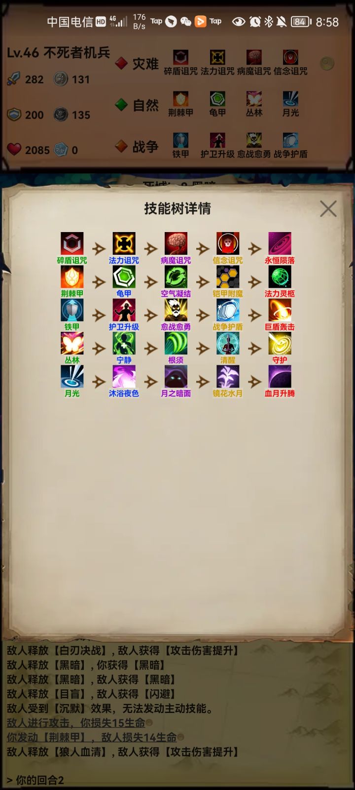机械-机甲护盾、光芒-快速治疗、森林-月光:搭配起来近乎无敌,注意新生只学1级森林-荆棘甲:免控灾难-灾变:输出、场地灾难-代价:输出灾难-破盾诅咒:禁疗自然-利爪进化:快速触发至暗、加属性复活触发后的下一回合可能被一刀秒或者自己把自己奶死,成型后其他情况死不掉。我还真这样死过→_→无尽专属技能我虽然拿的血之冰雹但貌似没怎么用到,可能黑死病好些吧