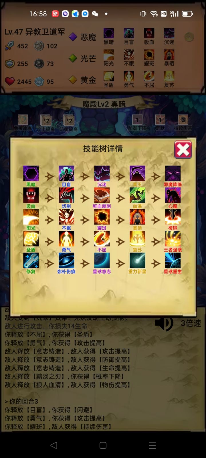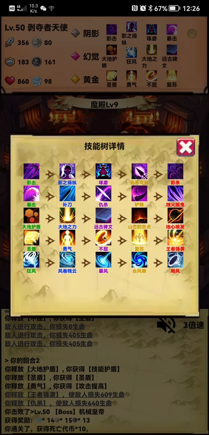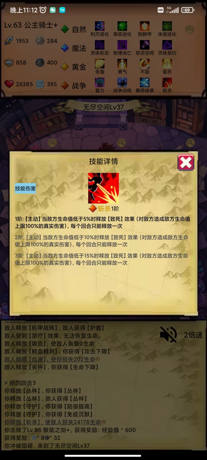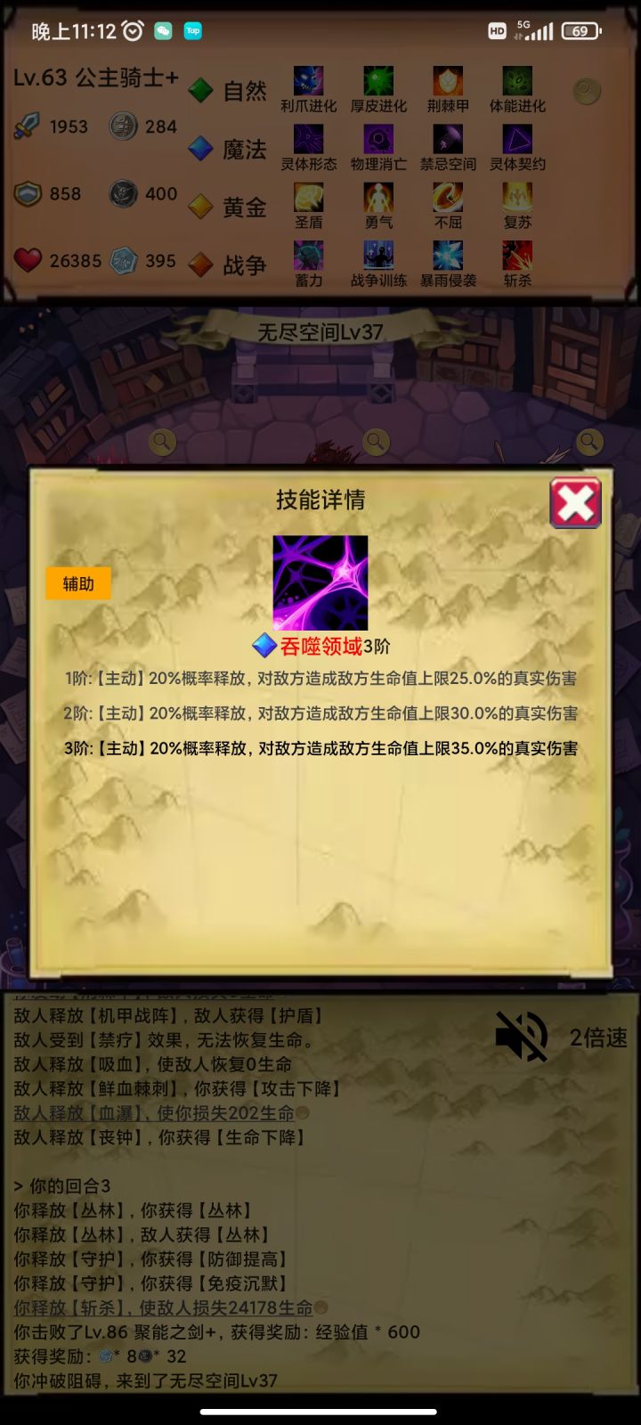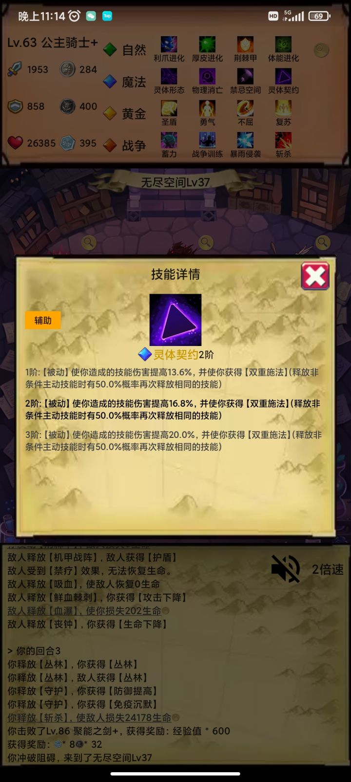 说说我的主题思路,开局大树三属性叠加,然后出灵体,翻倍叠加属性翻倍快乐!三属性选战争,出斩杀。打到无尽后,补个黄金出驱散,主要要禁疗这个属性。其他技能都选防御性或者治疗技能。输出全靠吞噬领悟+斩杀。真伤,百分比伤害,不吃攻击力加层,受暴击影响,有双倍施法加成。运气好,吞噬出双爆,一套秒杀。有免死也可以二回合斩杀100%真伤。其他时候都防御治疗狗命。可以点个丛林防止沉默,顺带加大量防御,🐶住就可以反杀任何怪。boss可能就怕90%免伤那个吧,真伤也免疫,很难搞。希望大神提点提点🙏🙏🙏
