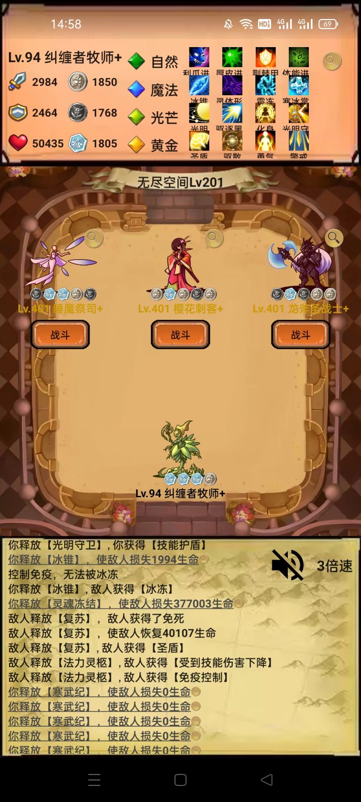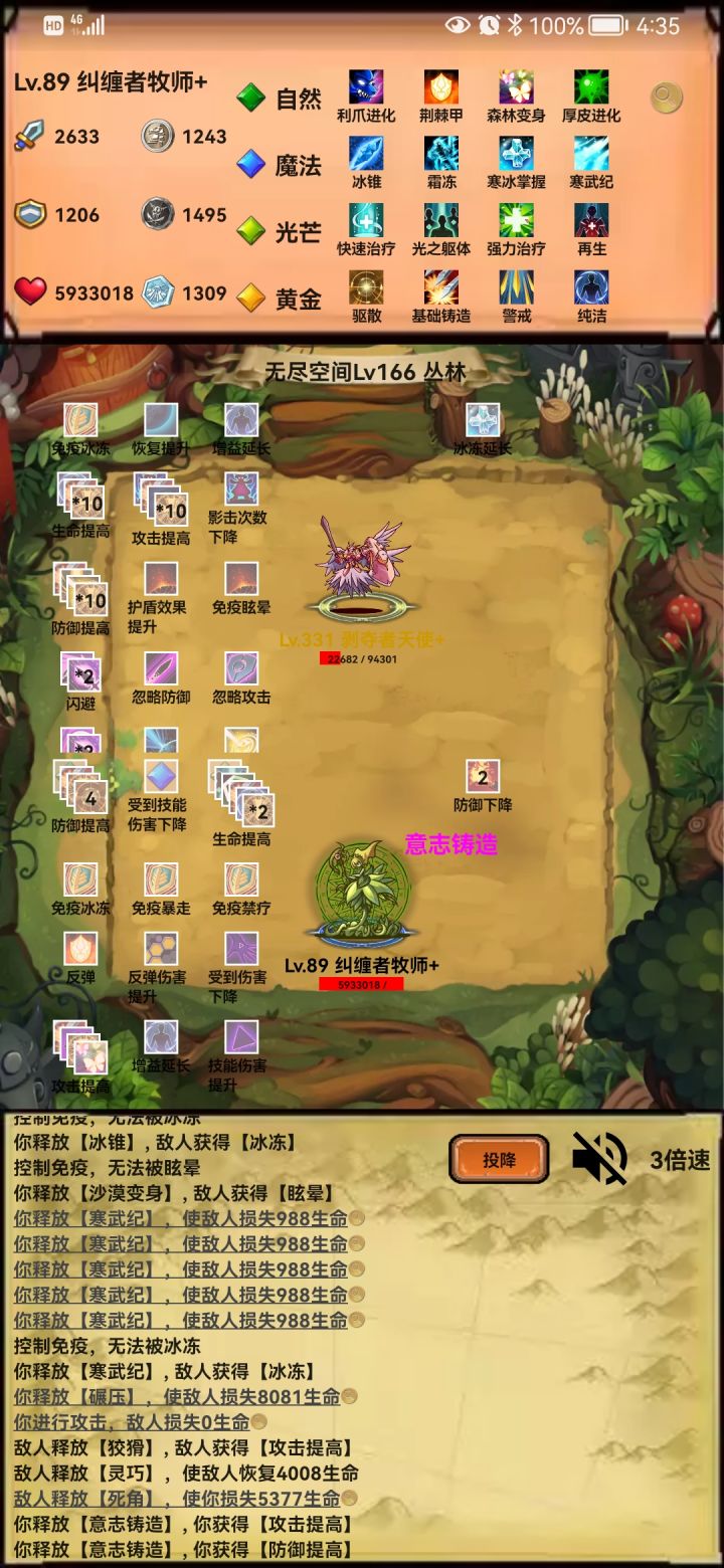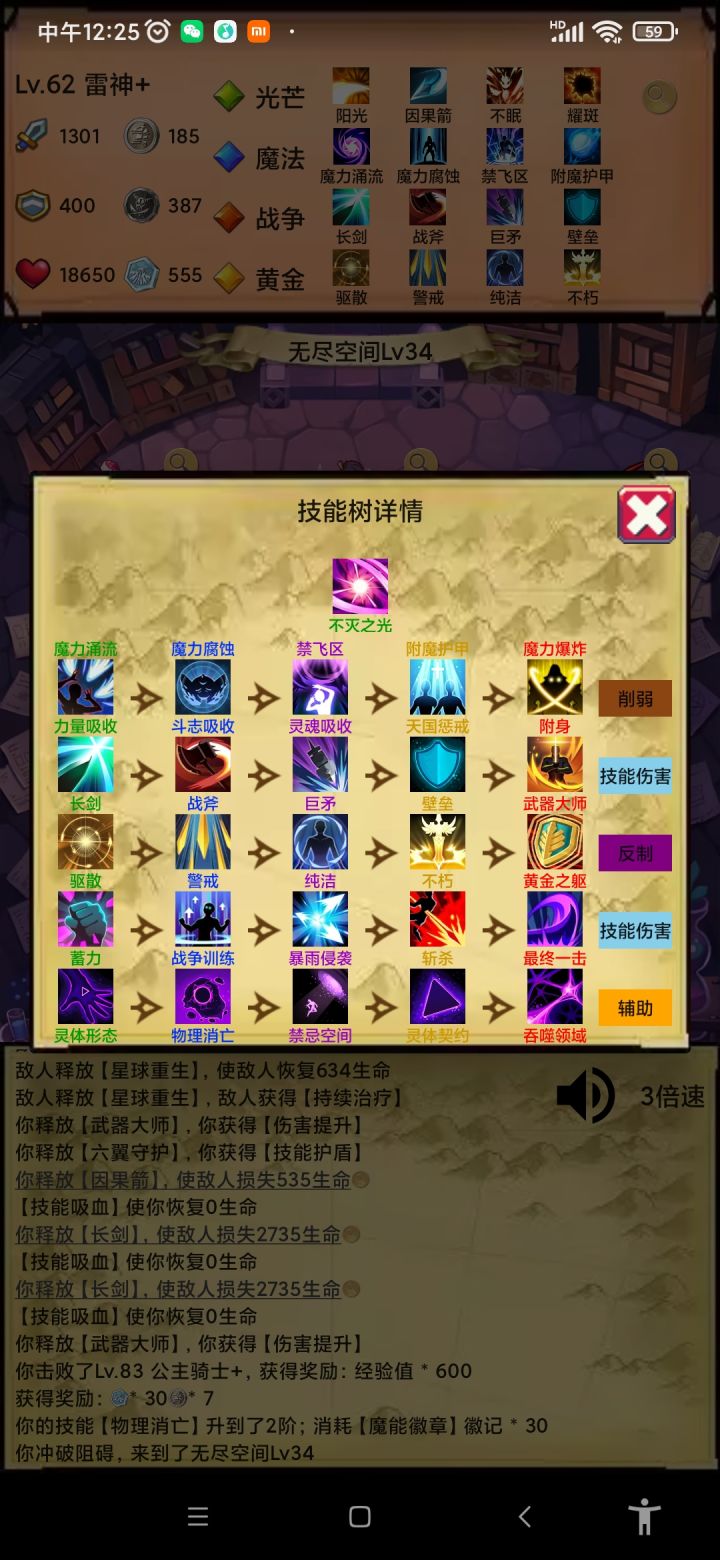 自然(利爪-反弹),光芒(光明-因果箭),魔法(冰锥-灵体),黄金(驱散-圣盾),前期普通图先(利爪,反弹,冰锥,光明,因果箭),灵体是没办法普通攻击的,你技能不多的时候是真的推不动图,无尽的时候选择不死秘术撑一下前期,等把黄金的不死点出来就有两个回合的无敌了。这个流派就是靠着灵魂冻结和吞噬星空的真实伤害打秒杀效果的,除了160关那个BOSS有个十多回合无敌有点难搞其他回合基本都能在3-5个回合内解决。这个版本的控制除了沉默都是白给的,BOSS有免疫的时候更加无奈,所以打BOSS的时候没办法在第一个回合就触发灵魂冻结的秒杀效果把BOSS无敌打出来果断退了在继续游戏,不然很白给的。
