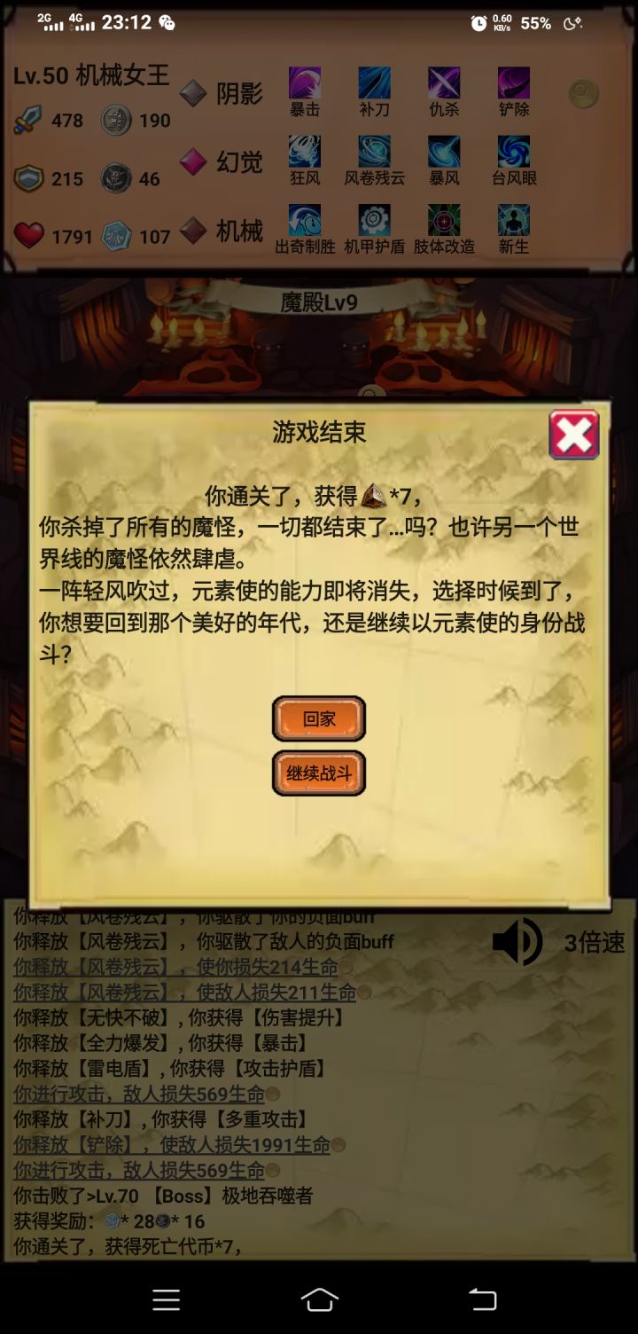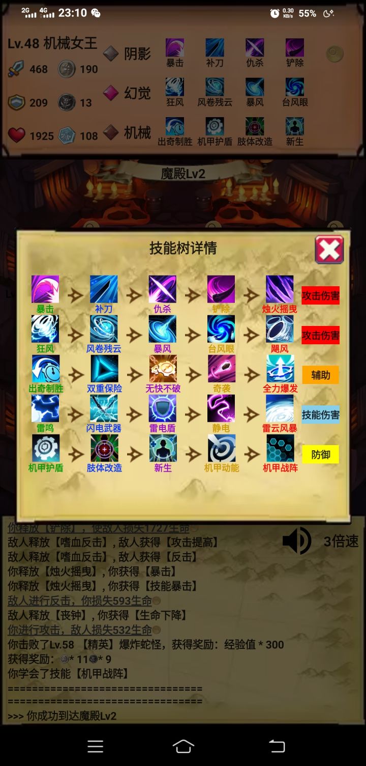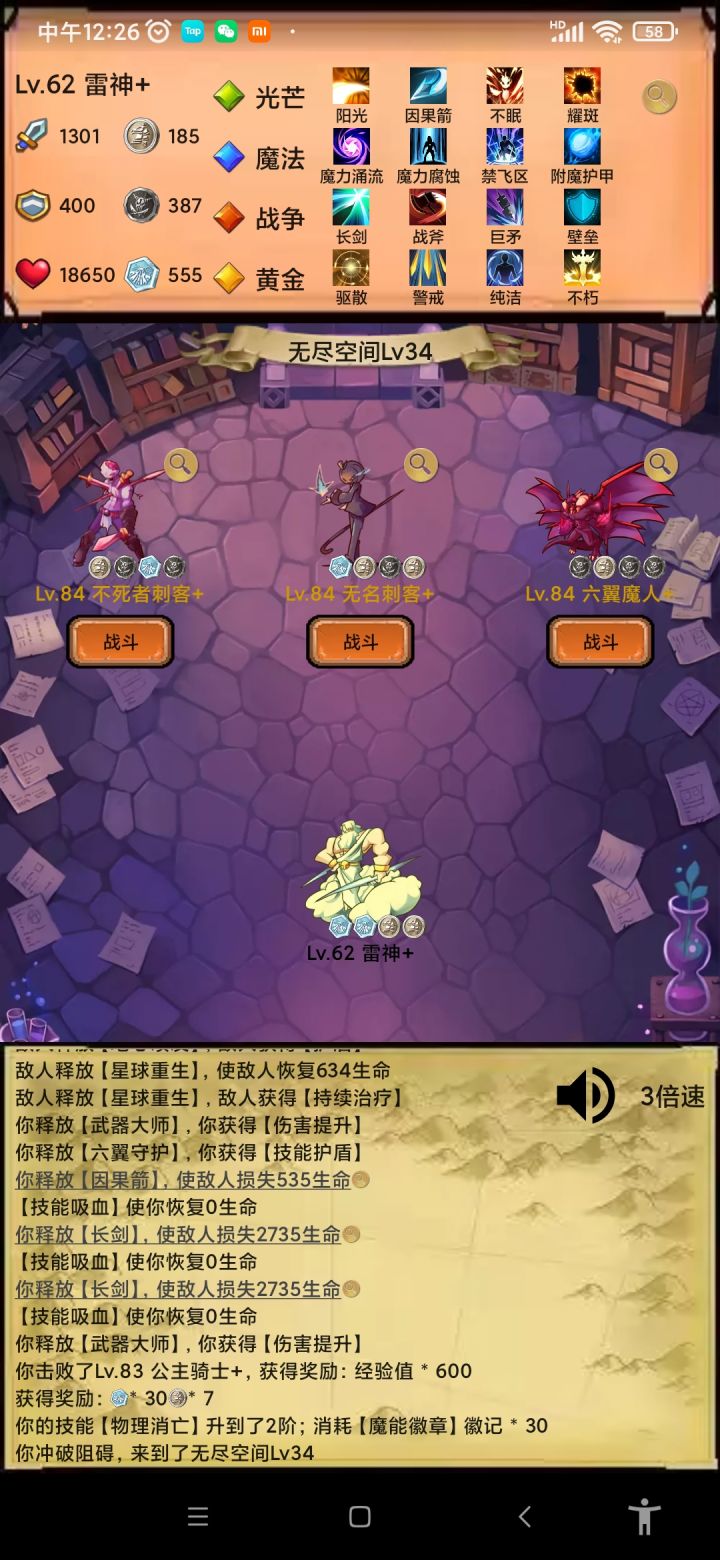 自然(利爪-反弹),光芒(光明-因果箭),魔法(冰锥-灵体),黄金(驱散-圣盾),前期普通图先(利爪,反弹,冰锥,光明,因果箭),灵体是没办法普通攻击的,你技能不多的时候是真的推不动图,无尽的时候选择不死秘术撑一下前期,等把黄金的不死点出来就有两个回合的无敌了。这个流派就是靠着灵魂冻结和吞噬星空的真实伤害打秒杀效果的,除了160关那个BOSS有个十多回合无敌有点难搞其他回合基本都能在3-5个回合内解决。这个版本的控制除了沉默都是白给的,BOSS有免疫的时候更加无奈,所以打BOSS的时候没办法在第一个回合就触发灵魂冻结的秒杀效果把BOSS无敌打出来果断退了在继续游戏,不然很白给的。