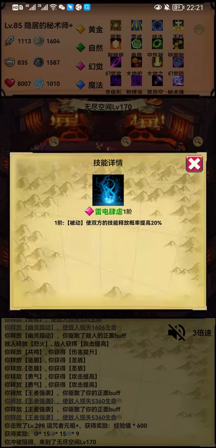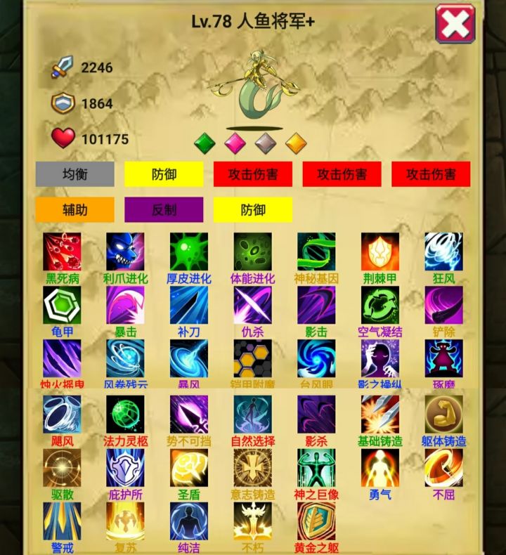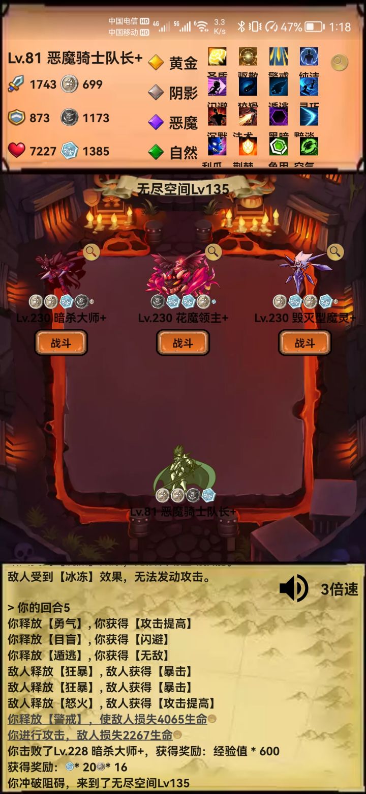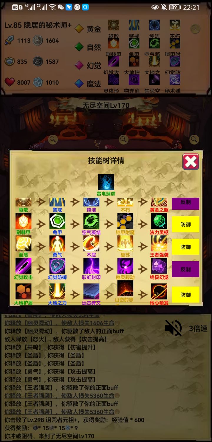 1.2.8版本挂机玩法,挂机流人鱼将军技能学习顺序,第一优先级进化,第二优先级狂风,暴击,影击第三优先级荆棘甲,同一优先级不分先后,到无限后选黄金优先学习圣盾点出无敌然后学习基础铸造点出意志铸造,最后学习驱散点出黄金之躯,其中王者强袭不要学,神之巨像优先级很低,到了无尽见怪就打,自己看着表,超过一分钟没出结果sl重打一个怪,大概率半分钟不到打完,反正只需要注意看表就行了,人和怪互相刮痧,适合边水群边挂机,不过魔方属性低的不知道打起来效果如何