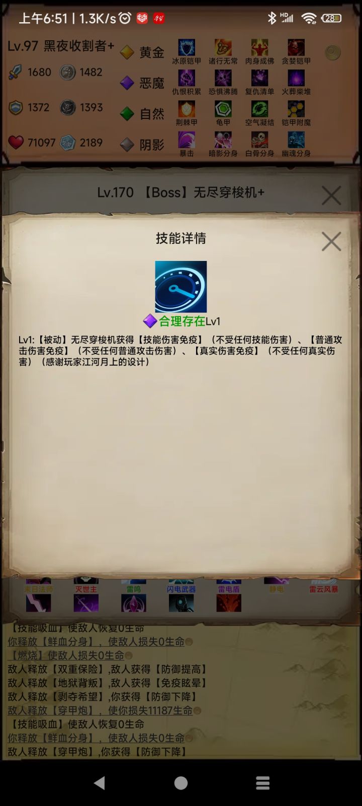 1.7.16版本终于通关地狱难度无尽了,分享一下我的技能组合!主要技能:英灵铠甲+佛怒+复仇天神能秒boss一条命,凛时雨+返魂术每次都能秒boss一条命,天地同寿+返魂术也能秒boss一条命,血少的boss亘古长夜+凛时雨也能每回合秒一条命,最后还有唯我独尊兜底!没有任何boss能活下来😁其他技能可以更换,神之巨像是为了避免返魂术之后血量过低的,法力灵枢免控!神器哪个都行,都没啥用。
