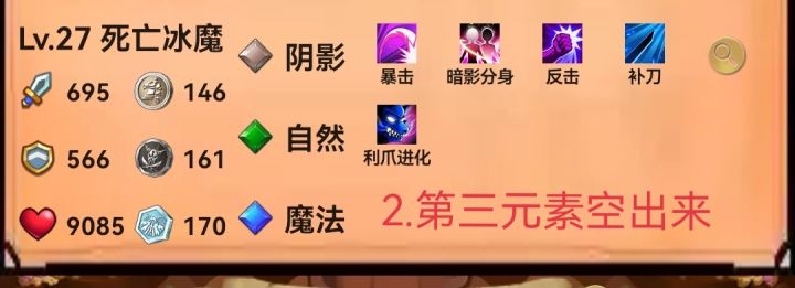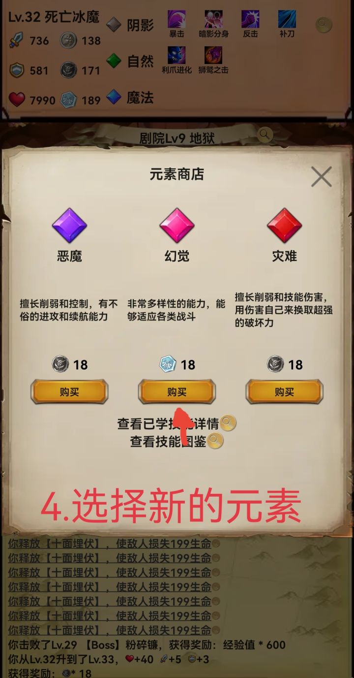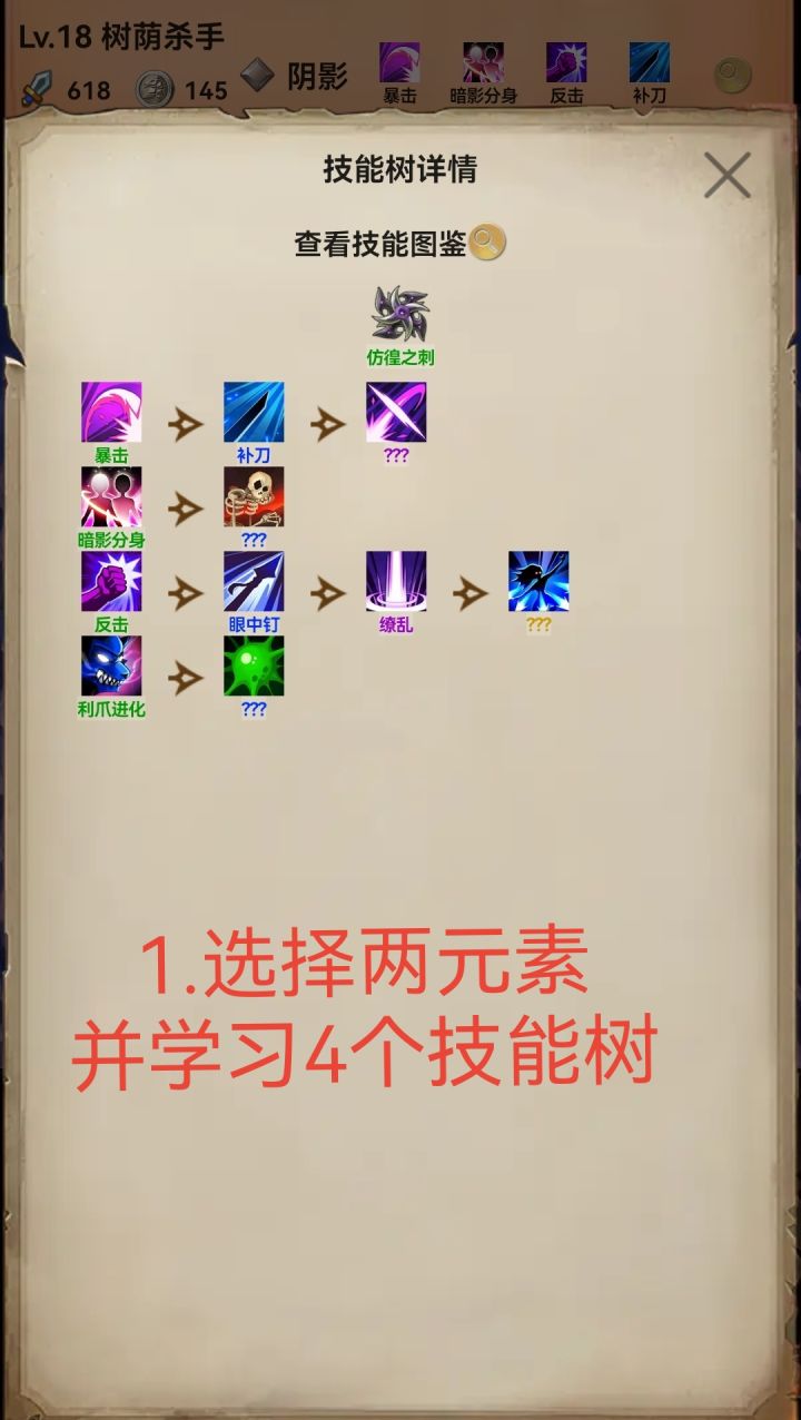 1.游戏有十大元素,开局选一种元素进游戏通了关卡boss后可以再选一种,但普通模式上限是三种,无尽是四种选满了再选其他的会被顶掉一个升级可以学新技能或者升已有技能,是根据技能树路径从低级到高级这样,比如你想学神秘基因,就必须学利爪进化这个前置技能具体升几级能选不知道,不过一般都能在打最终boss的时候学满三系五技能树技能树最高能学五种,注意没对技能搭配有所了解之前不要同一种元素选太多技能